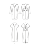 Slim V-neck pullover knit dresses in two lengths have long or short sleeves with cutout back and twist detail. One view features contrast layout.