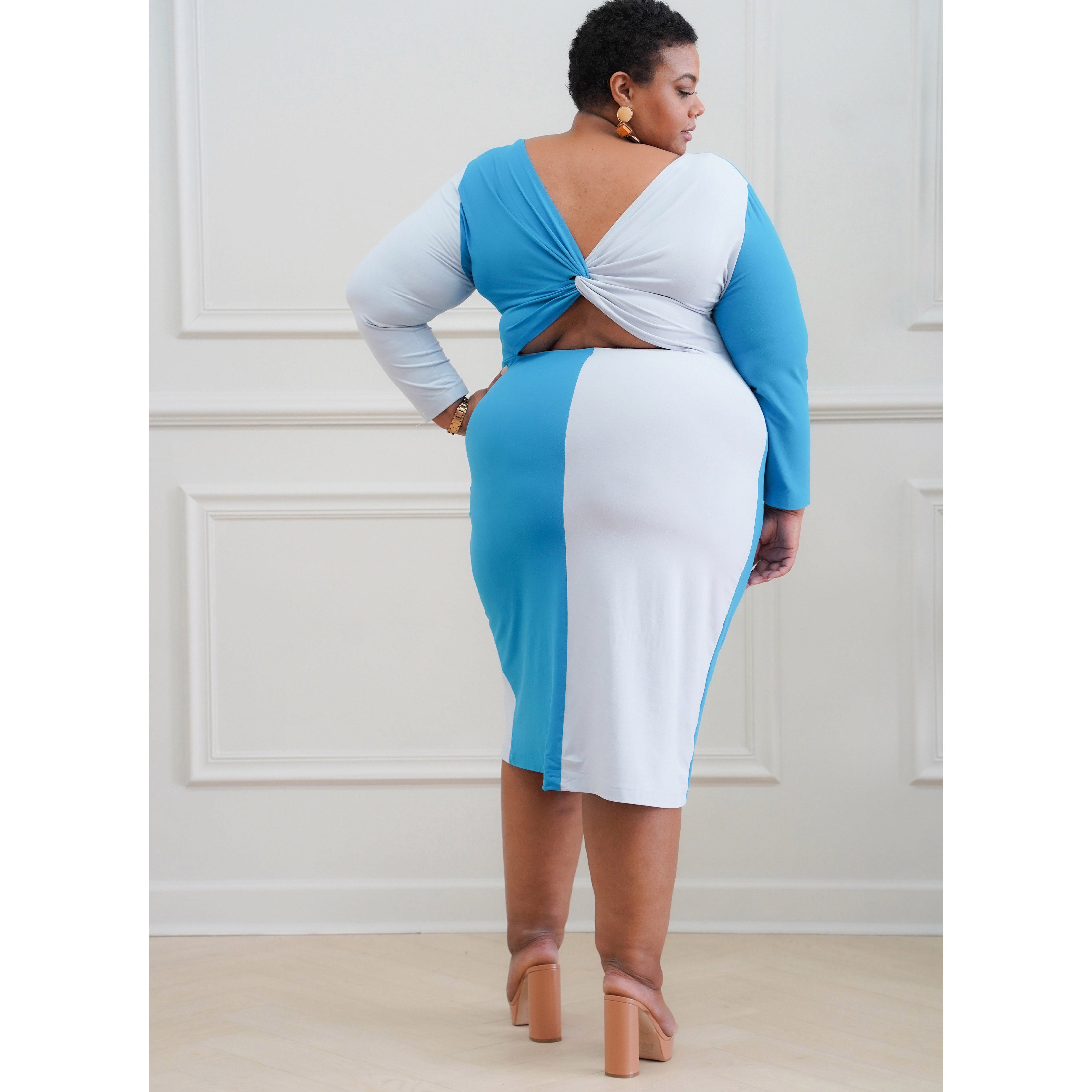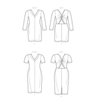 Slim V-neck pullover knit dresses in two lengths have long or short sleeves with cutout back and twist detail. One view features contrast layout.