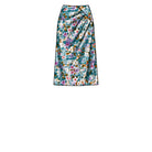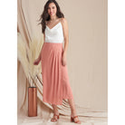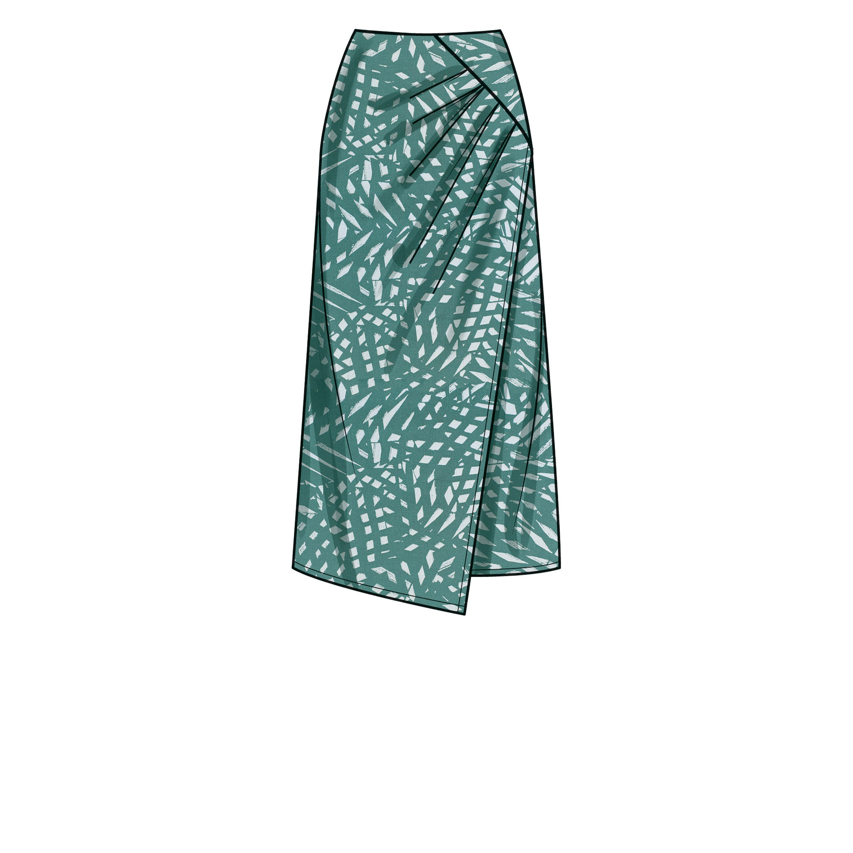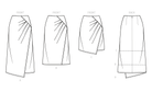 Faux wrap skirt has pleats set in side panel and asymmetric hem. Straight hem option has contrast panels. All skirts have back waist darts and invisible back zipper.