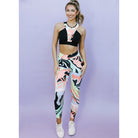 Sleek, stylish sports bralette comes with matching leggings and bike shorts. Bralette features a high neckline with angular princess seams that give a feminine, futuristic look. Leggings and bike shorts have contoured waist band and crotch gusset; shorts feature mesh cut outs.