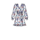 Self-tie front bodice dress has sleeve variations. View A has flare short sleeves with gathers. Views B and C have ruffles and long sleeves with gathered shoulders and cuffs.