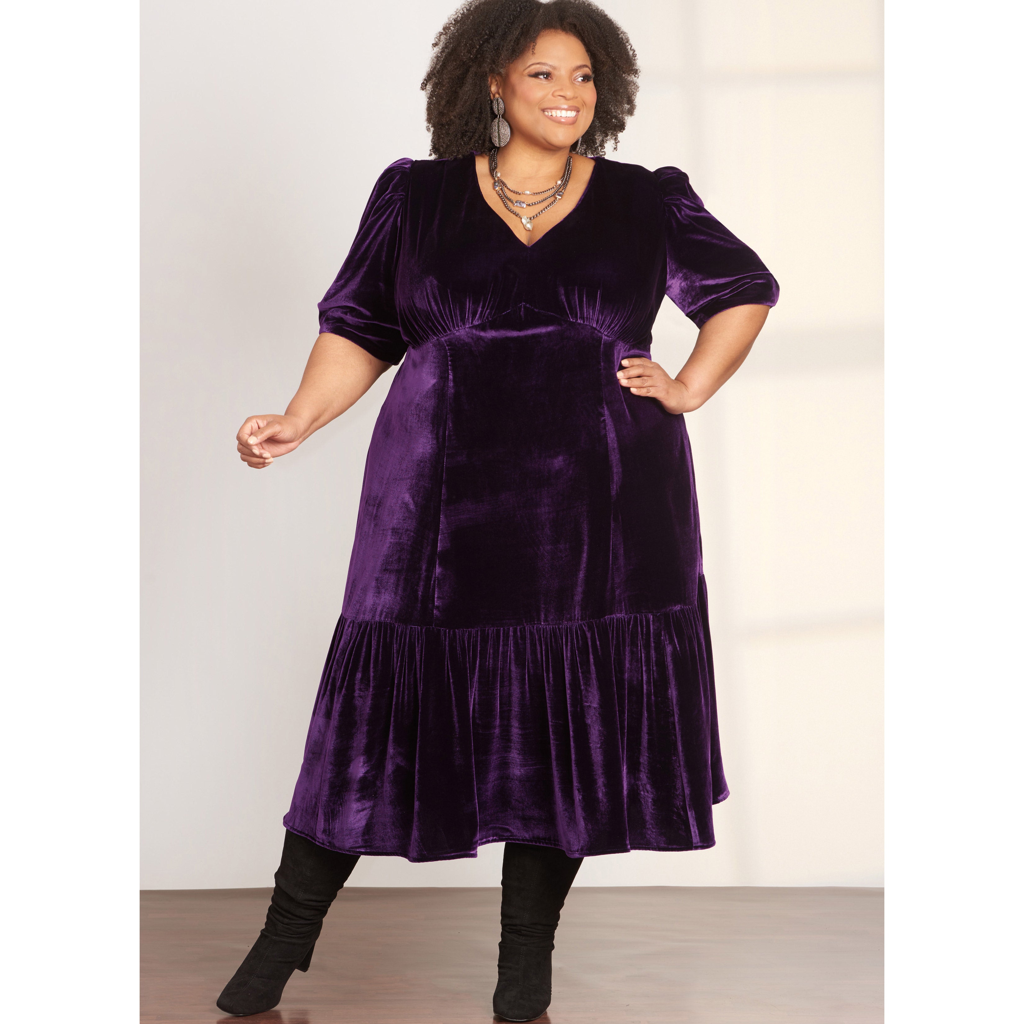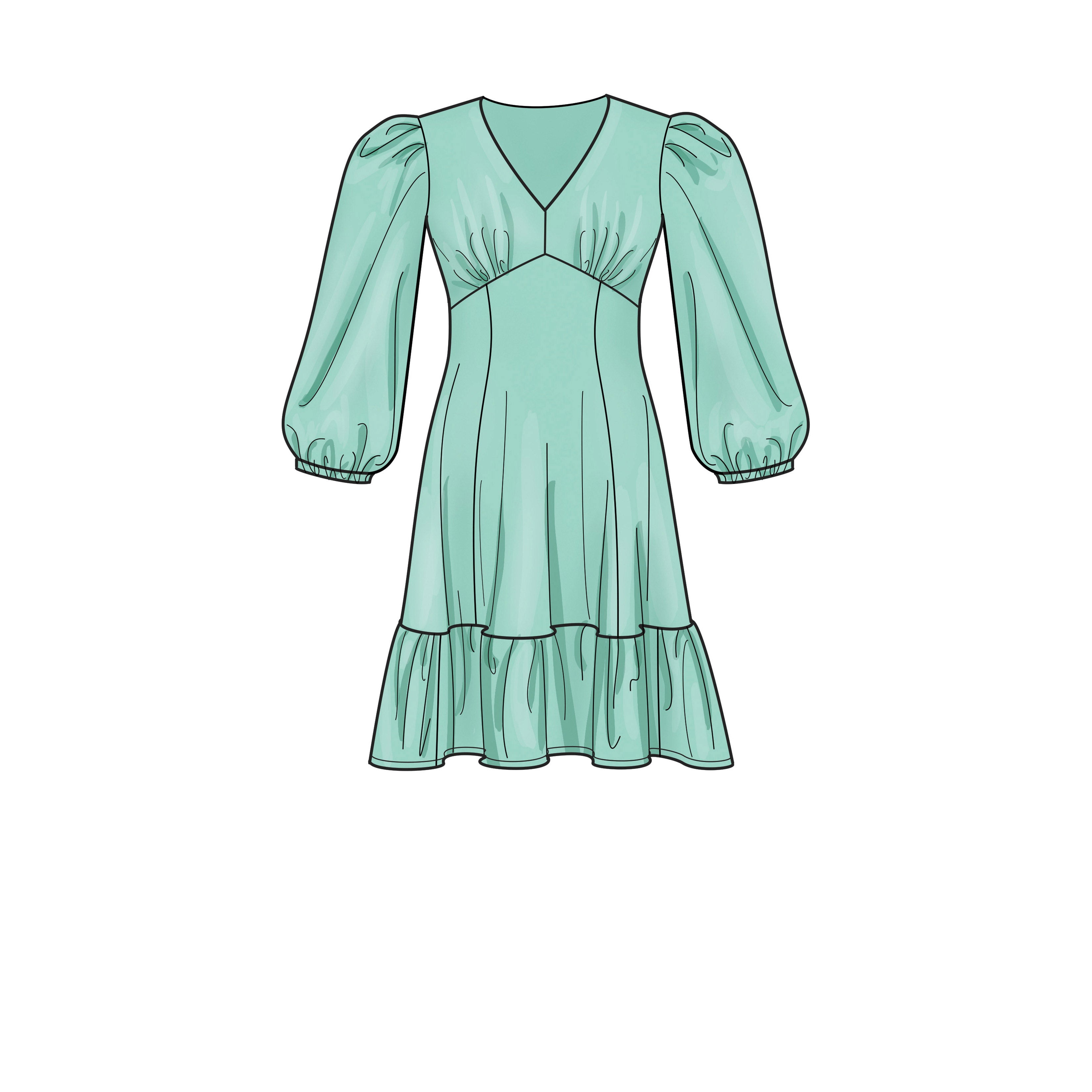 V-neck dress comes in three lengths with flounce. Dress has shaped bodice and short puffed or long sleeves gathered to wrist. Separate pattern pieces for C, D, DD cup sizes.