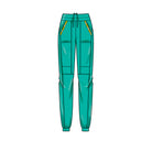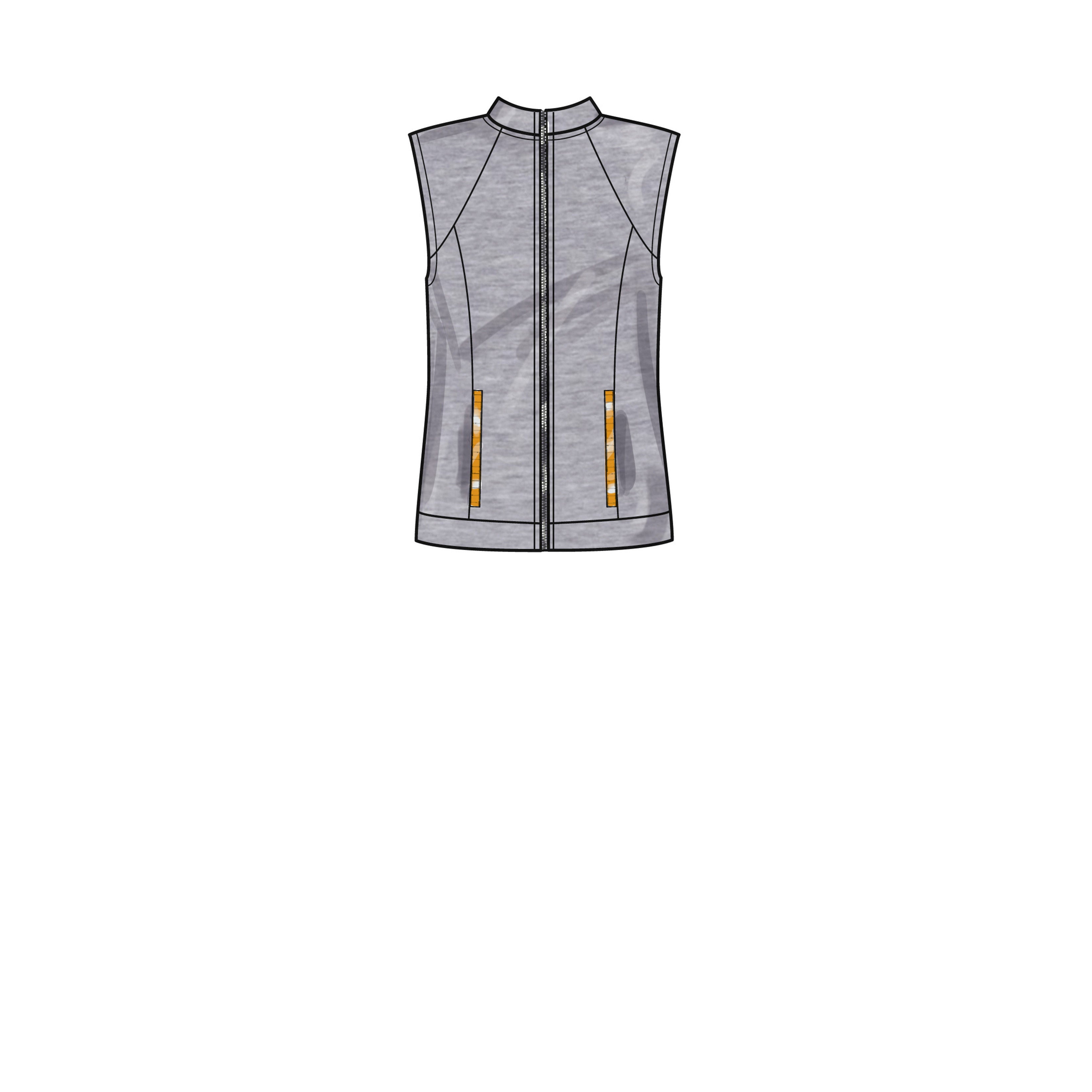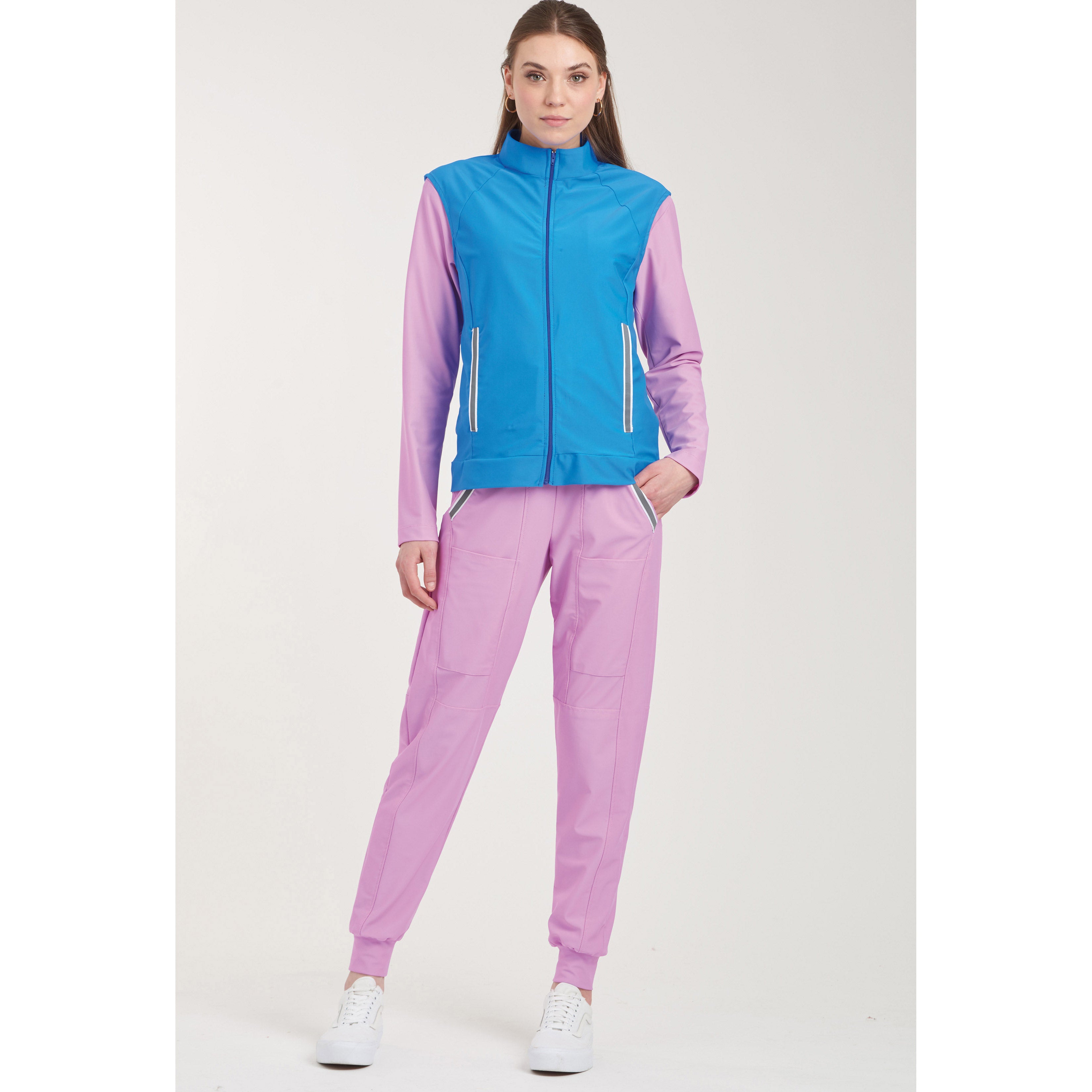 Knit vest has collar band, front zipped pockets, and shaped back hem. V-neck tuckable knit top has long or short sleeves, front pocket, and loop for ID tags. Jogger style bottom has inside drawstring at waistband, front and back pockets, and safety reflective tape.