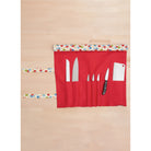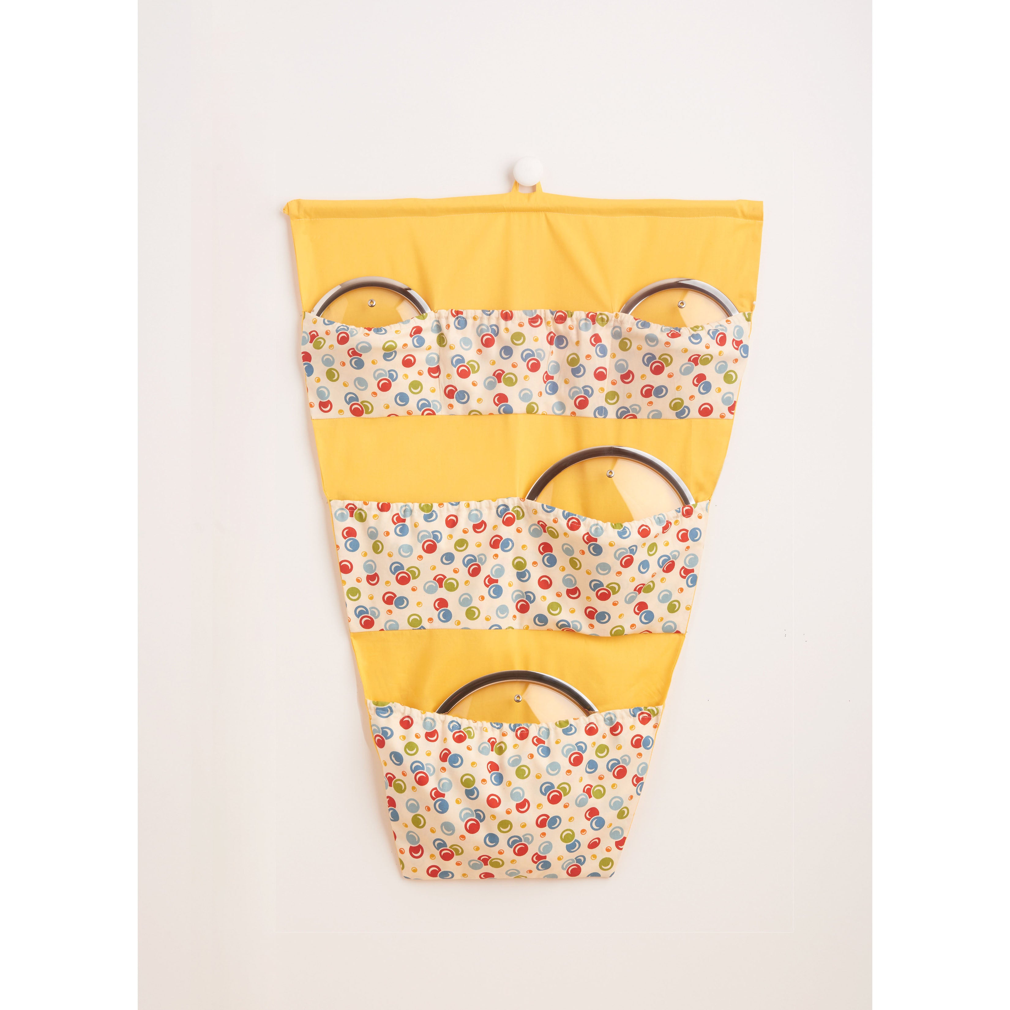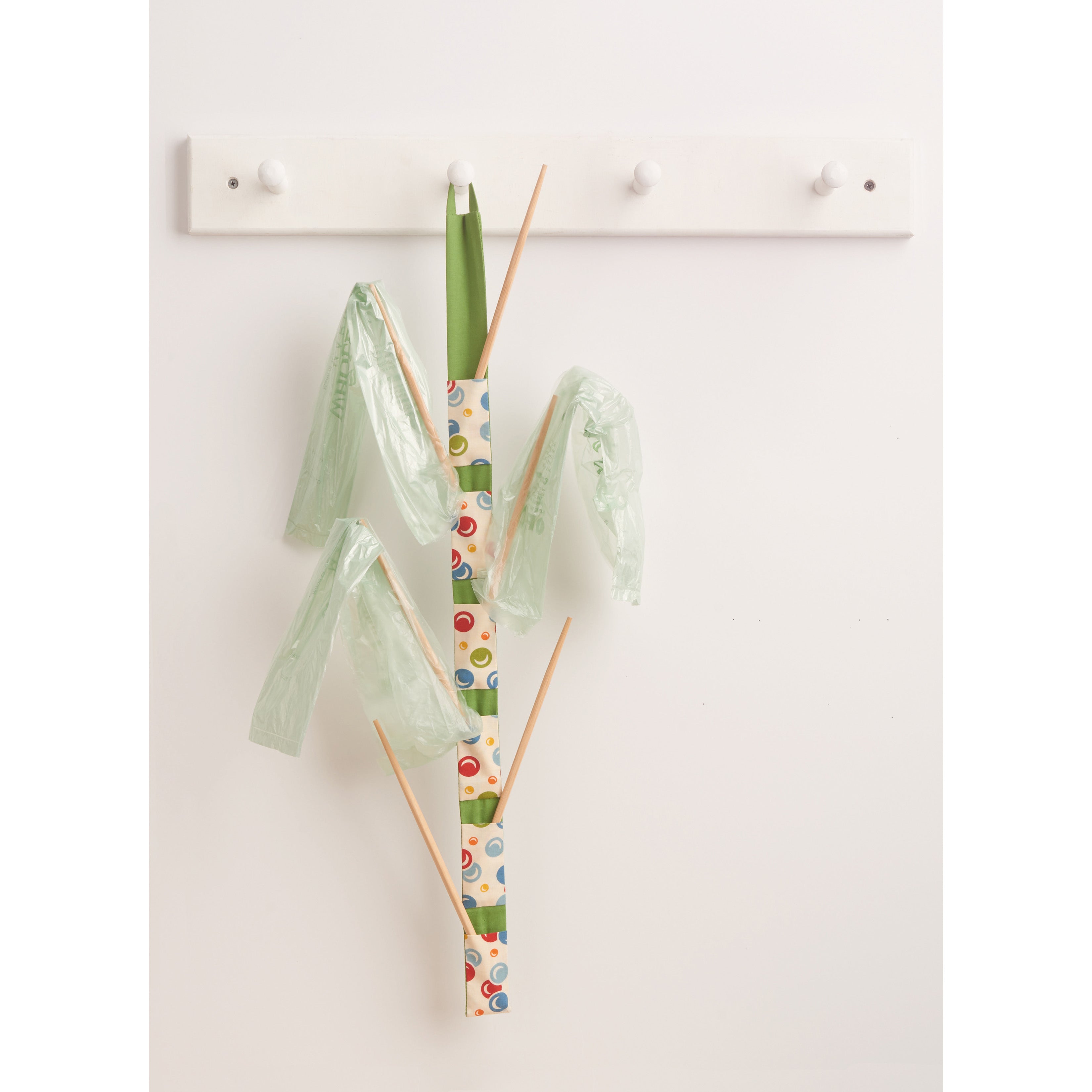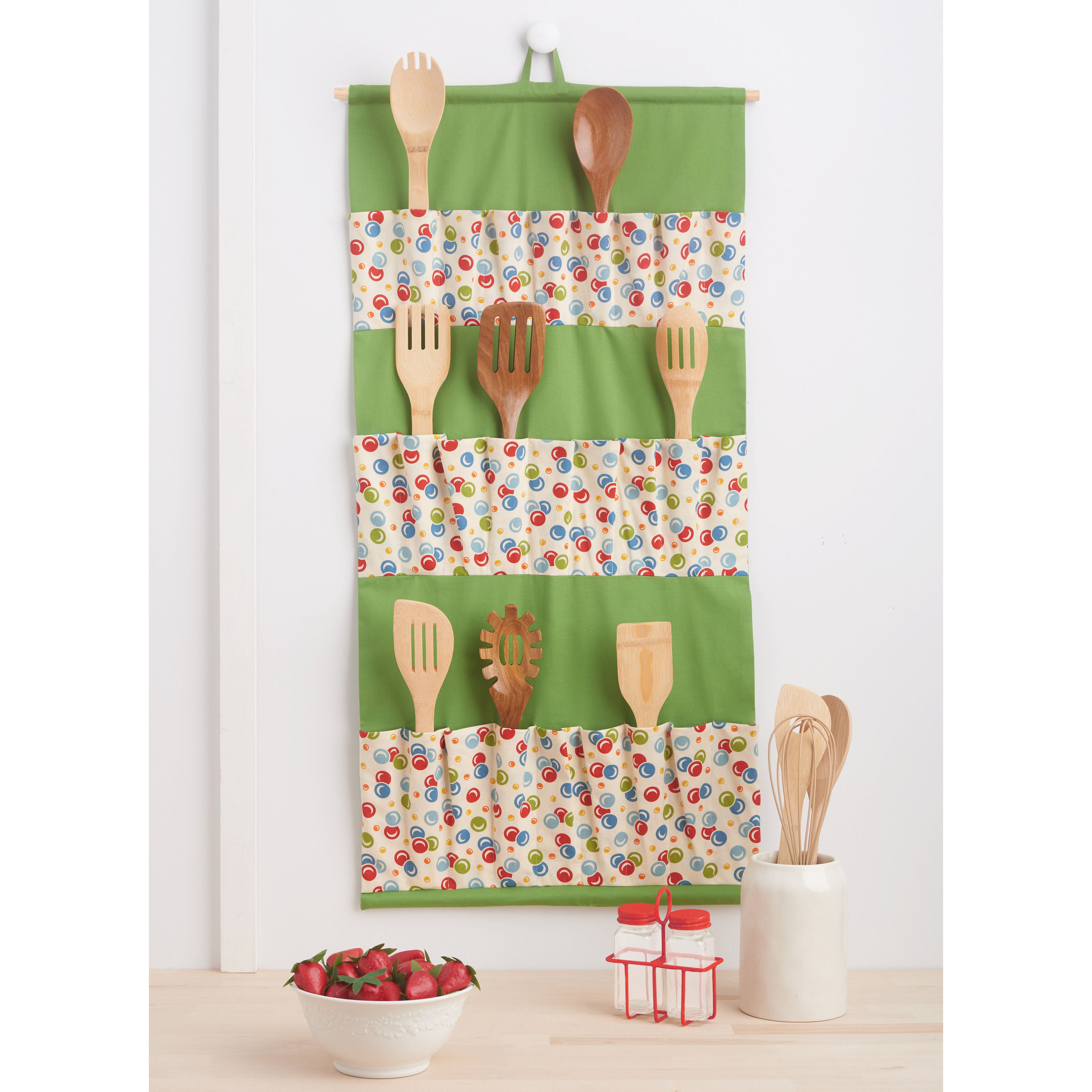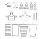 Knife roll, hanging towel, and gauntlet length oven mitt have contrast fabric accents. Utility apron with adjustable neck strap fits most adult sizes. Hanging utensil and pot lid holders have contrast pockets and wooden dowel supports. Hanging bag dryer uses chopsticks, just right for plastic produce bags. See envelope for more information.