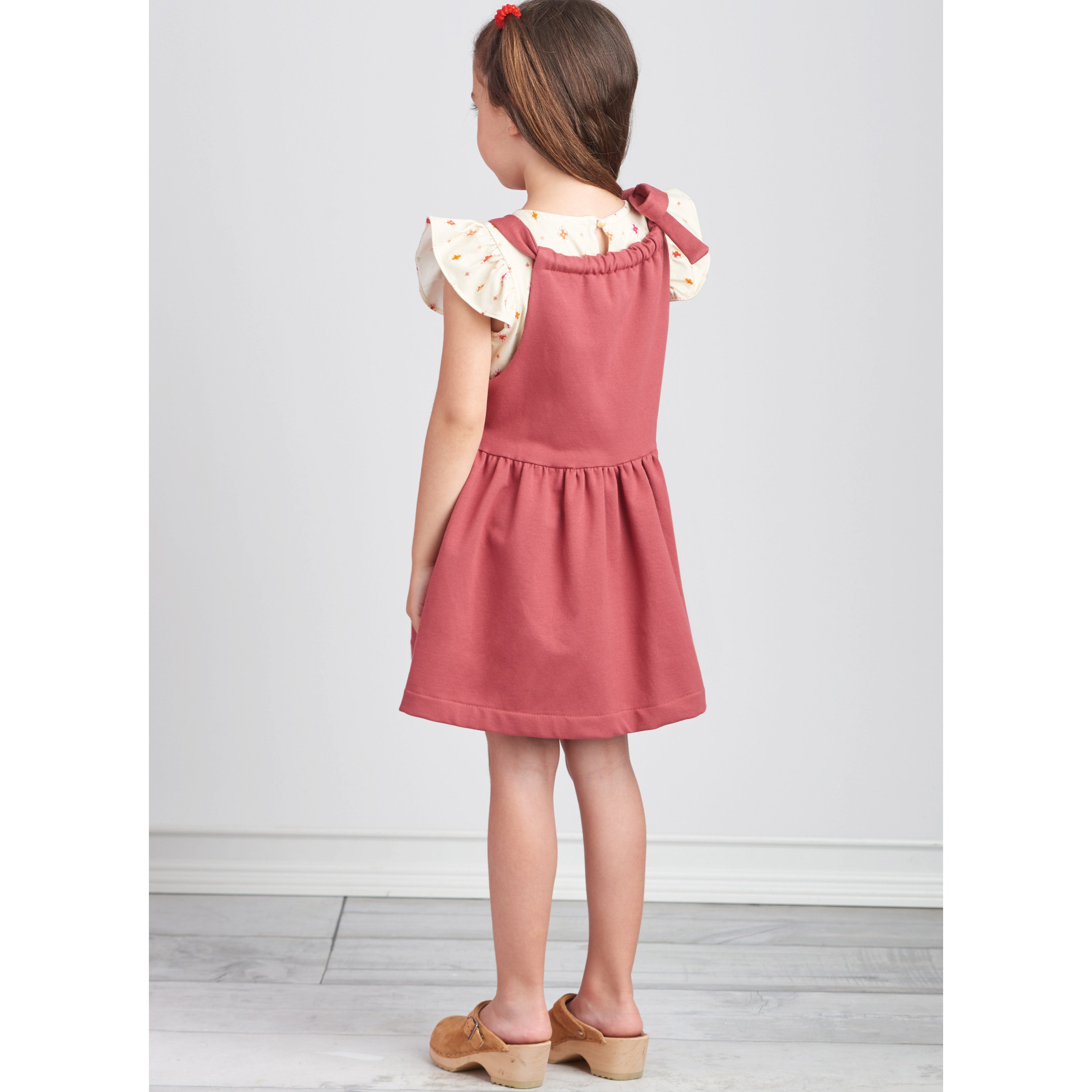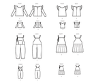Pullover knit tops have back button and loop closure and shoulder ruffles, and can be sleeveless or made with long sleeves. Step-in overalls and jumper have anchored drawstring forming straps and side bow, relaxed fit pants, and gathered knee length skirt. Matching doll clothes included. See envelope for more information.