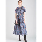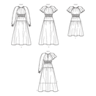 Dresses have gathers at neckline and raglan sleeves with variation for seam openings that tie close at neck. Gathers are created at waist with two rows of elastic casing. All feature tiered skirts available in two lengths and center back keyhole opening with hook and eye closure. Dress A has long sleeves with elastic gathers at wrist. Dresses B and C have flutter sleeves.