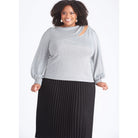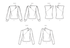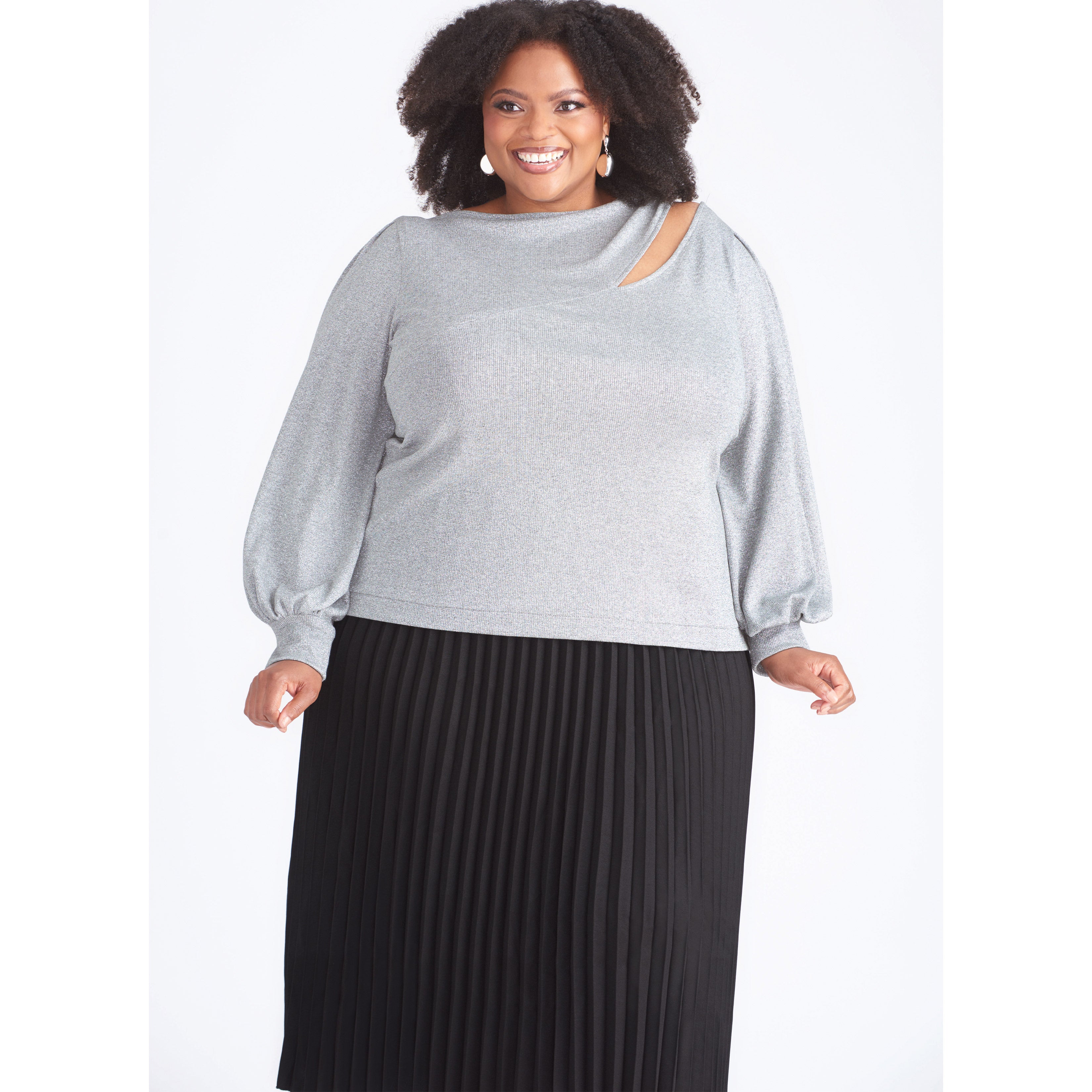 Knit tops have asymmetric cut-out along the shoulder for a sleek silhouette look. Top features long gathered sleeves with bands, long straight sleeves and sleeveless option.