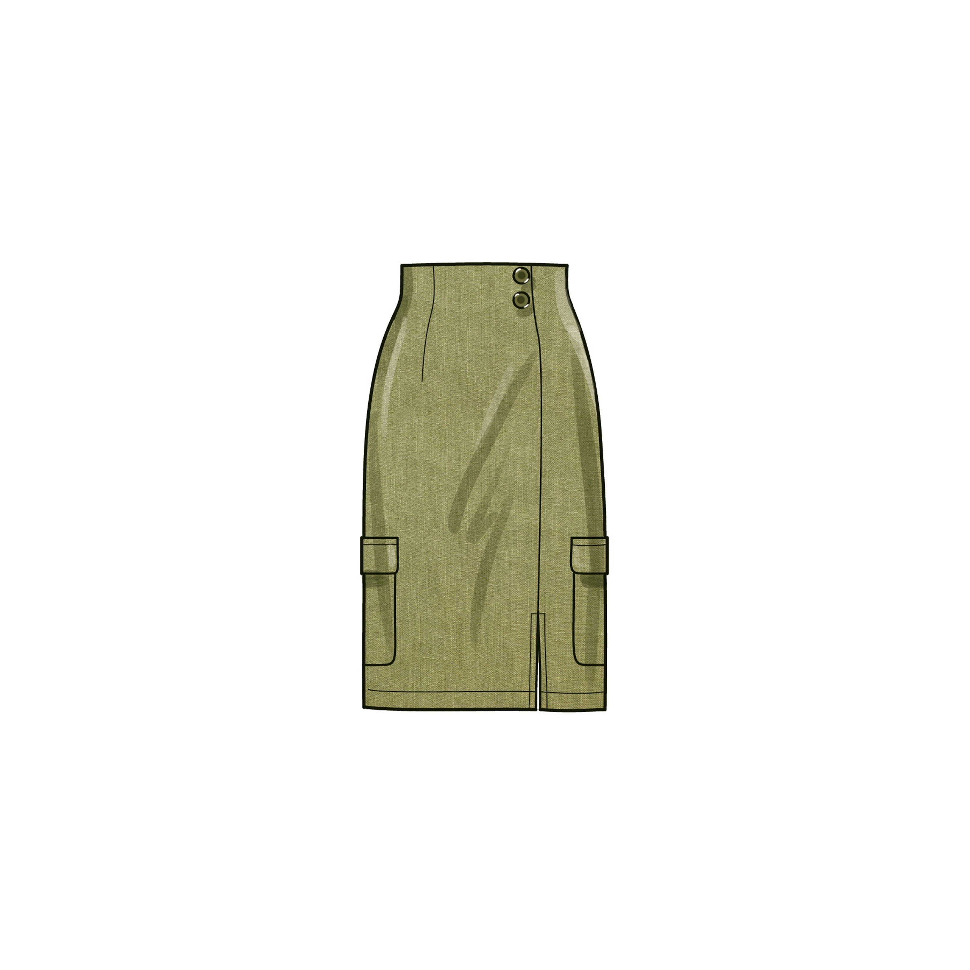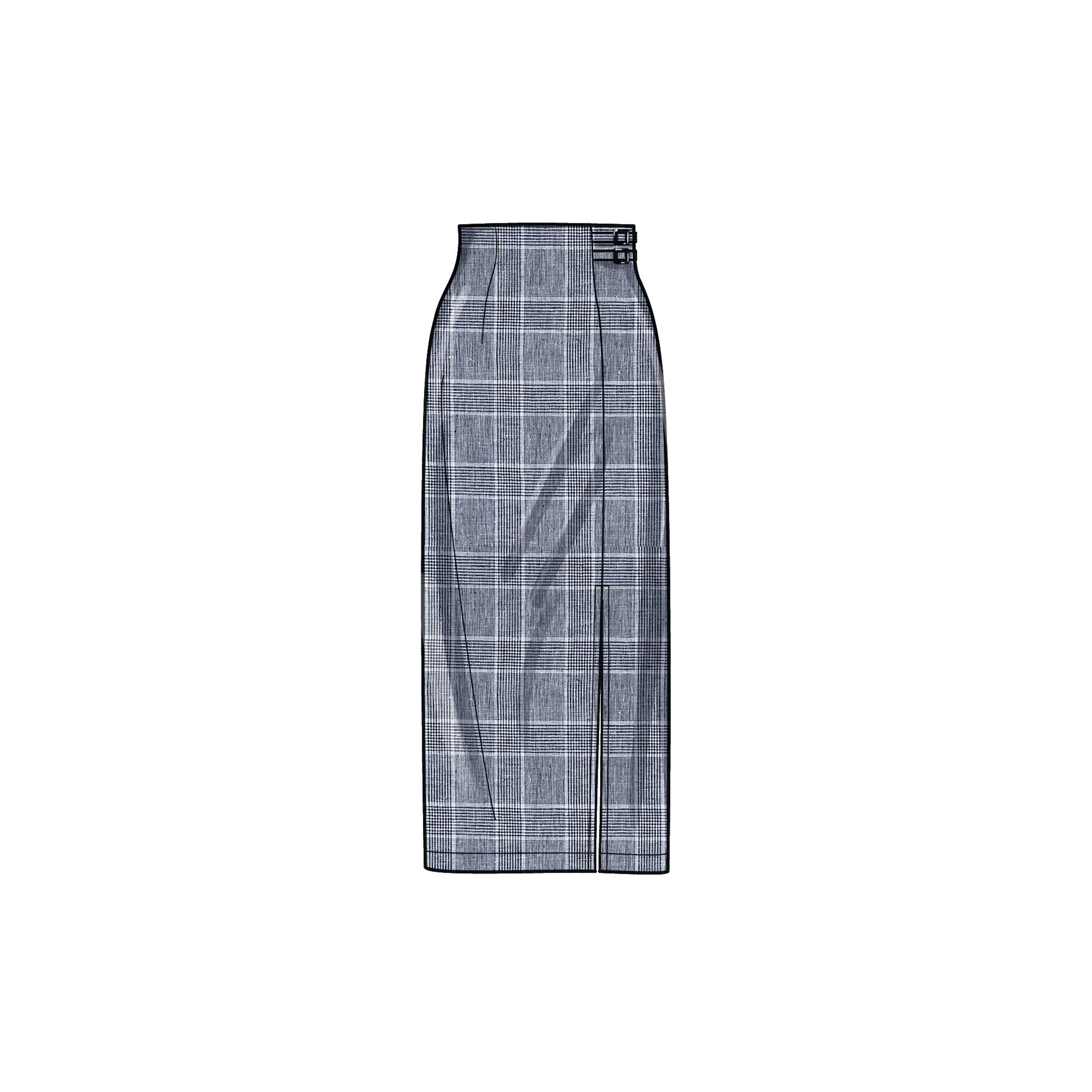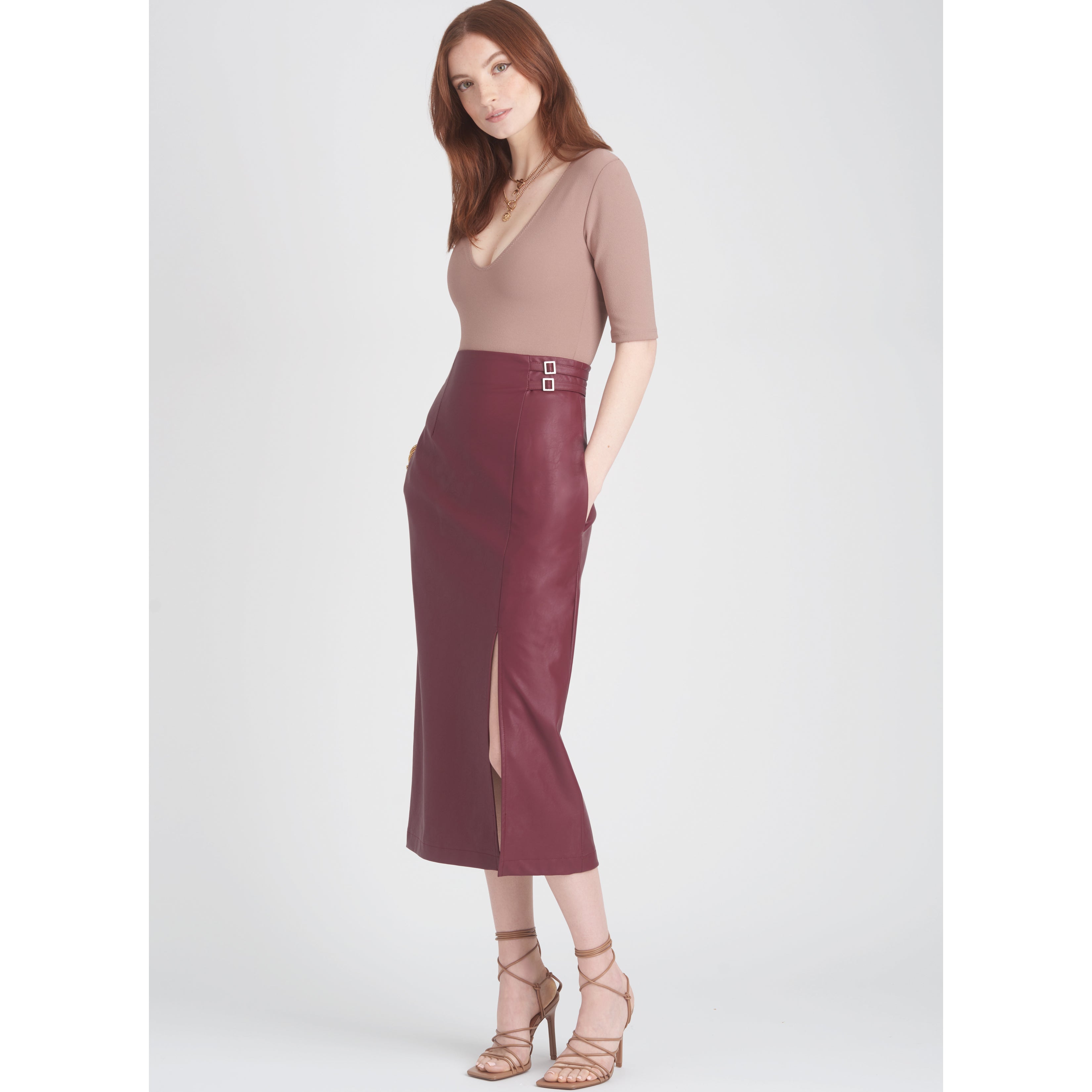 Slim or flared high waist skirts come in two lengths and feature back zipper, side seam pockets and optional slide buckles or buttons. Views A and B have a front slit and back darts.
