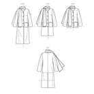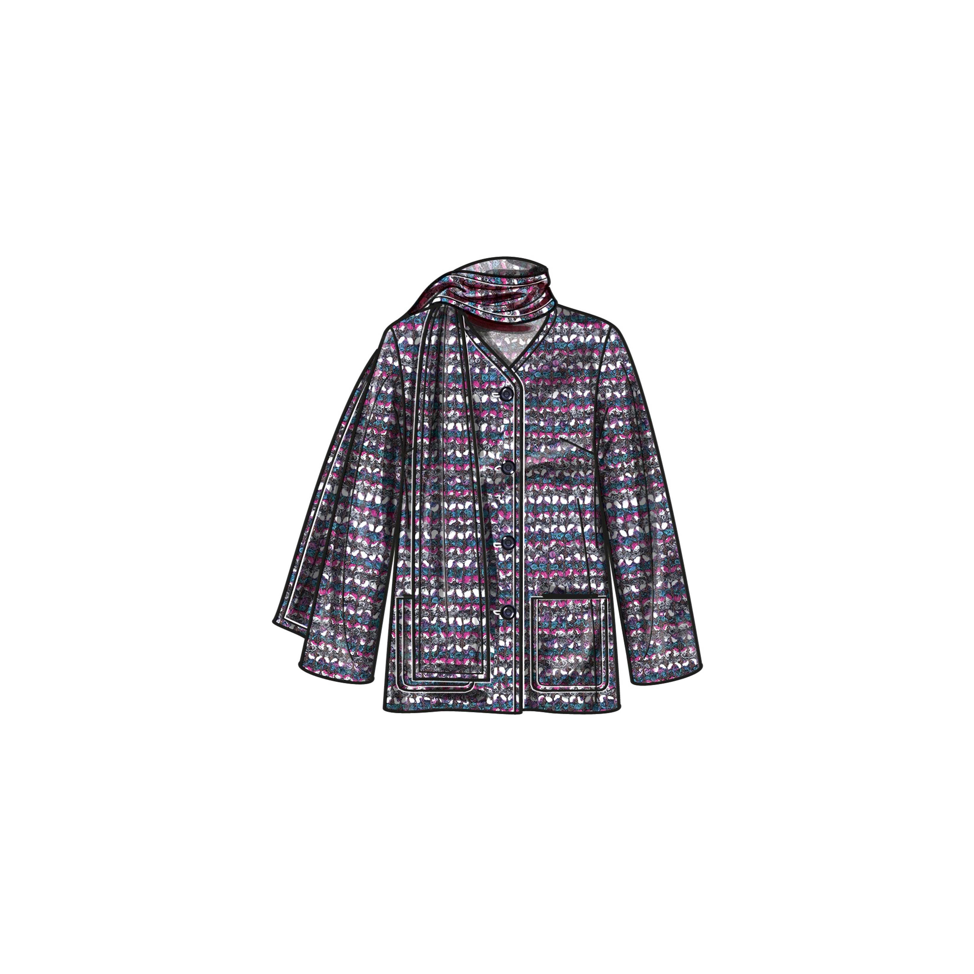Lined coat and jacket features attached scarf and has button front closure and pockets. Coat comes in two lengths. View C is a short jacket.