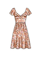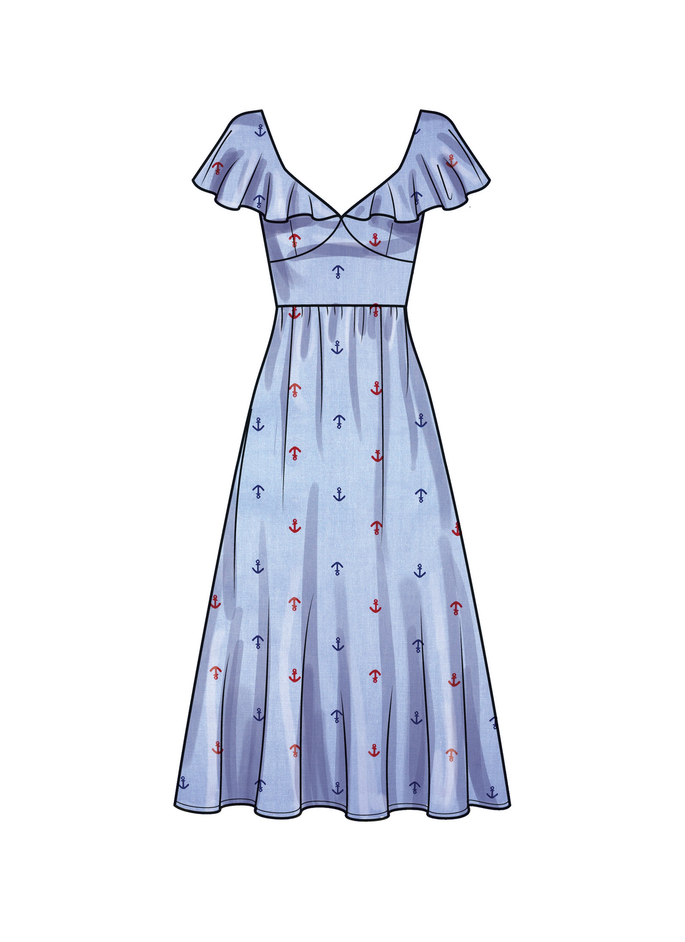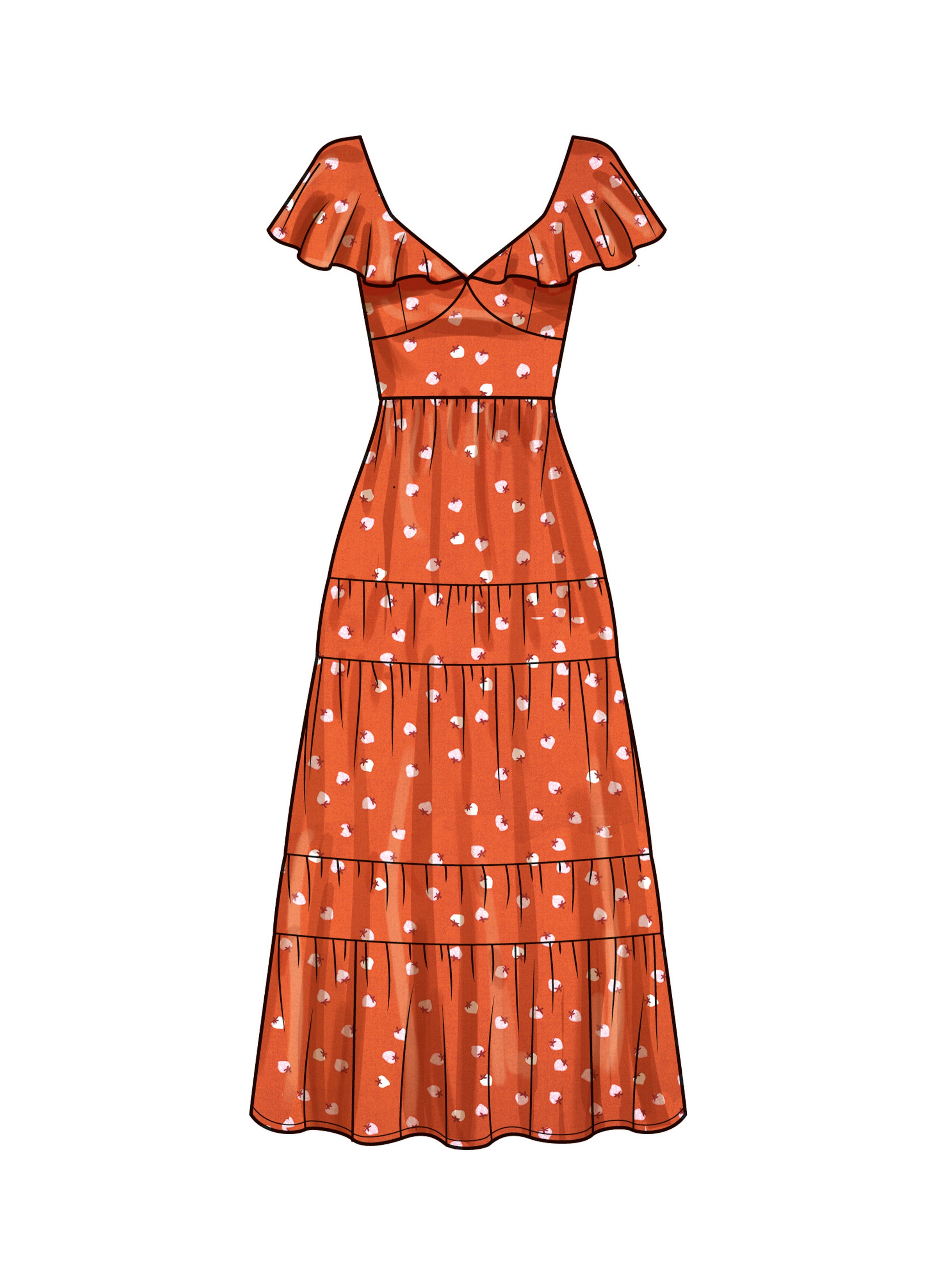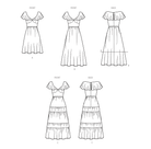 Flounce dresses with V-shape neckline and bust darts come in three lengths. This pattern features slight gathers at waist and gathered tier skirt. Dresses include lining in the bodice and yoke, invisible zipper, and side seam pockets.