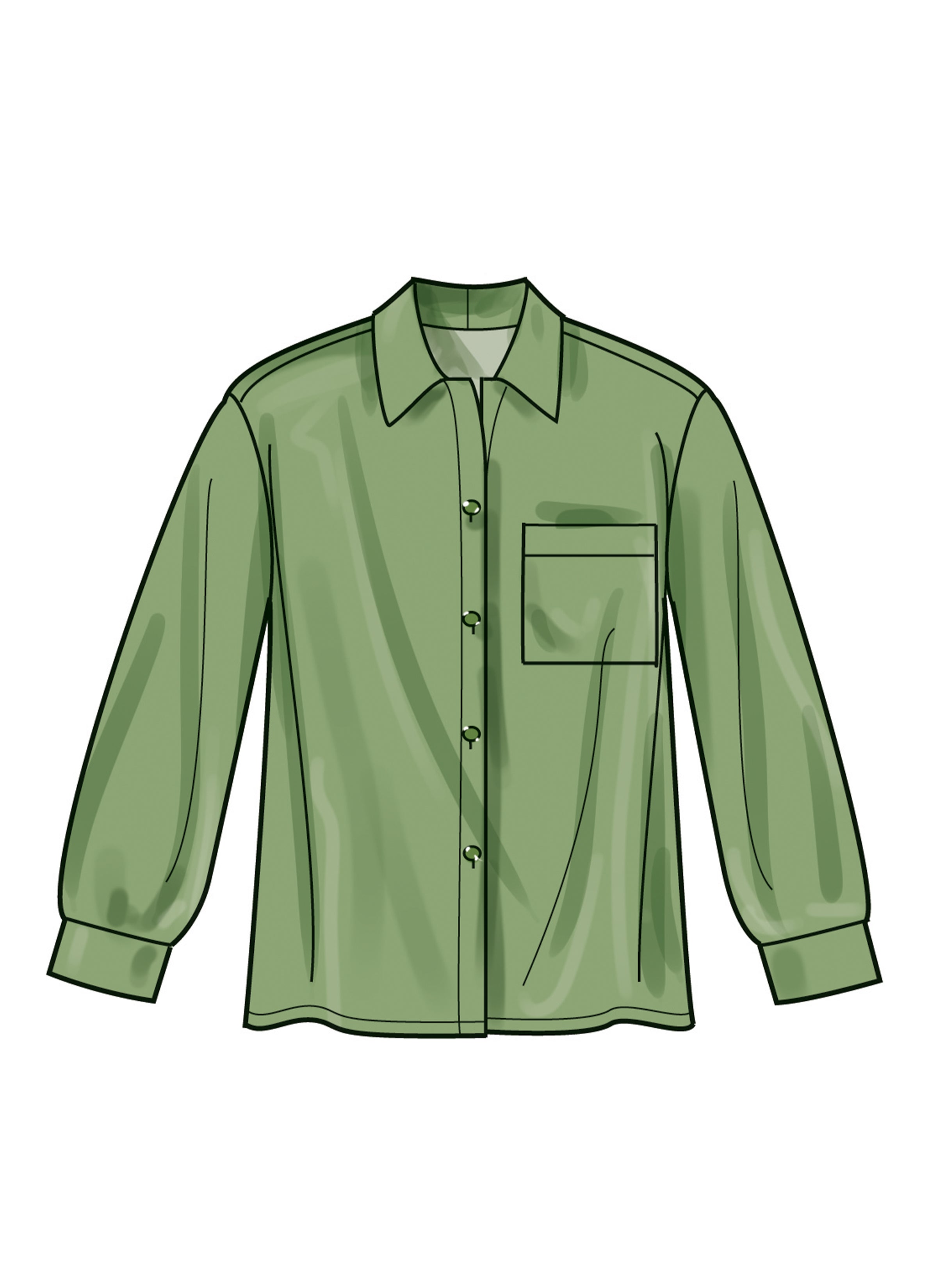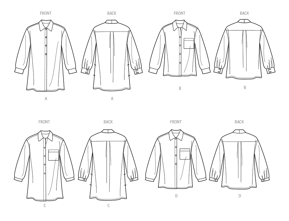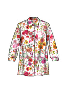 Relaxed fit button front shirt in two lengths features yoke, collar, and buttoned cuffs. Views A and C have side seam pockets.