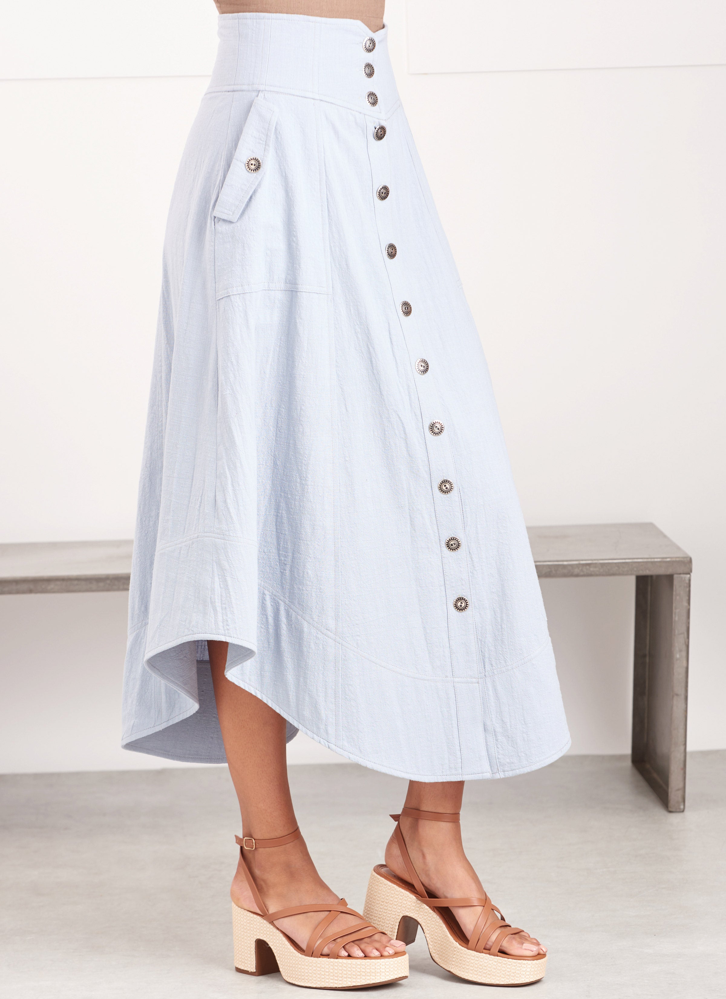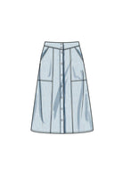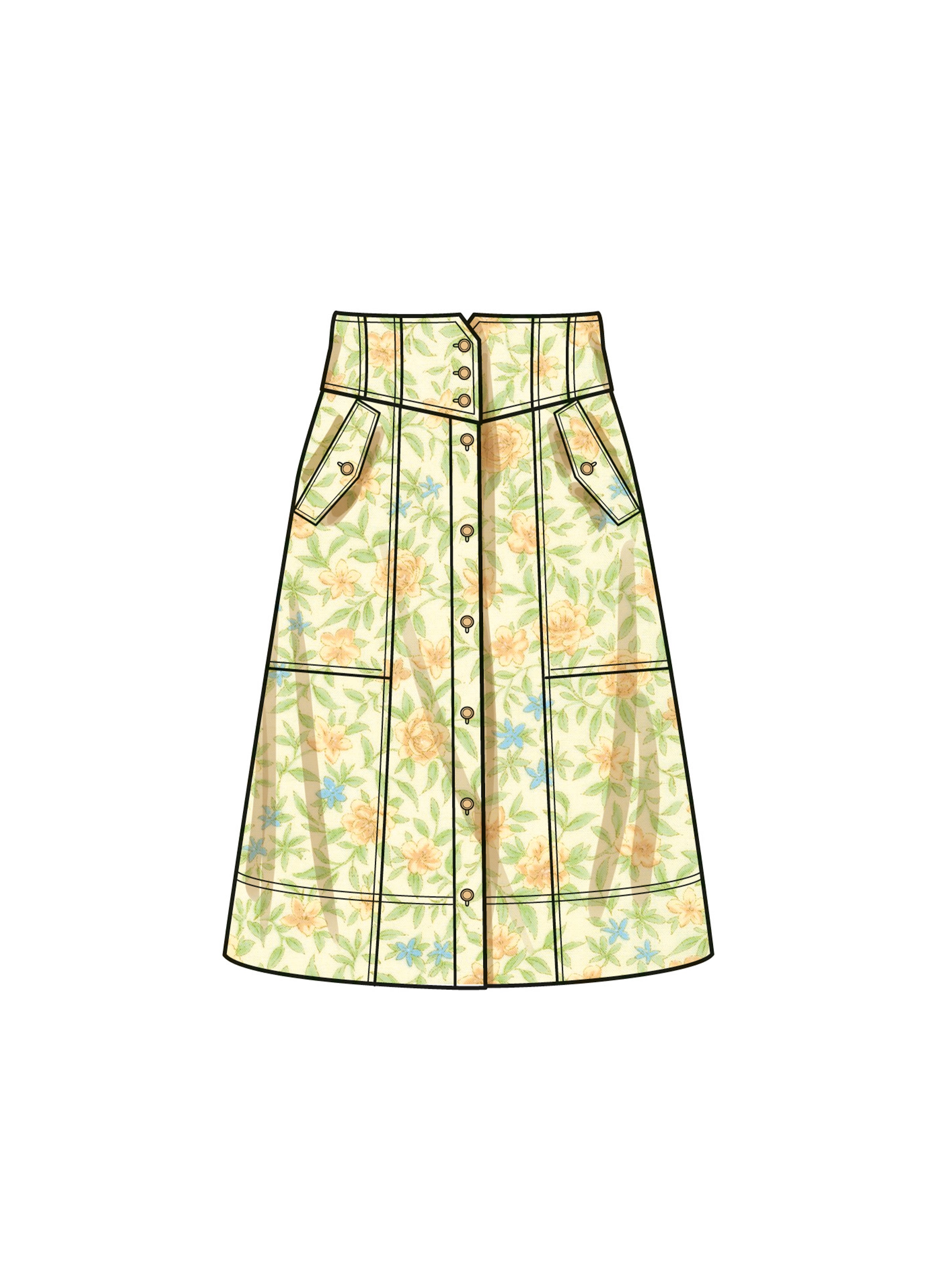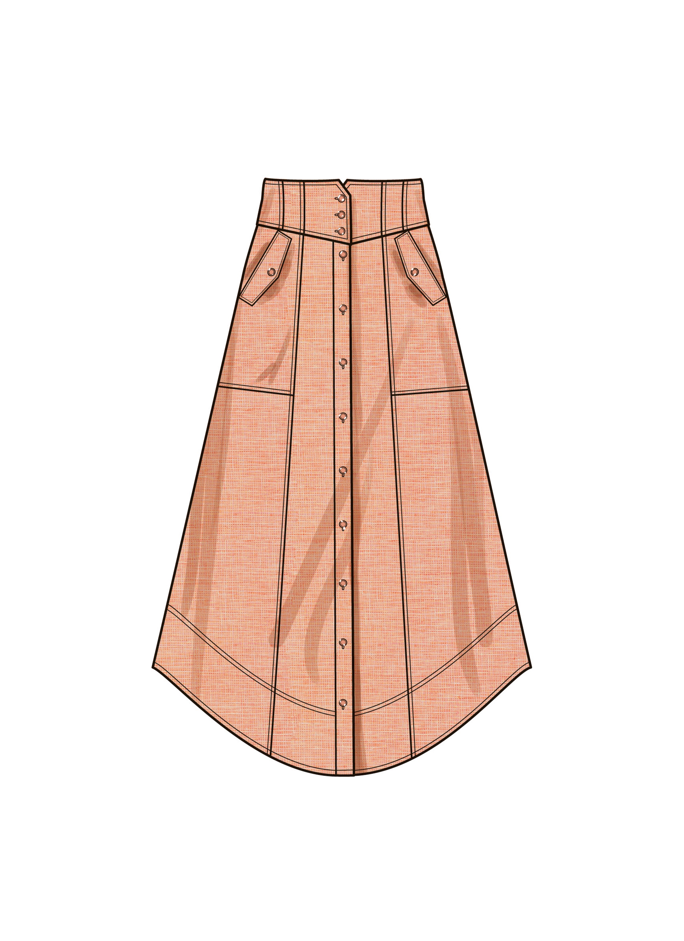 Button-front skirts feature yokes and have length and hem variations. Skirts include front slant pockets or flap pockets with button closure.