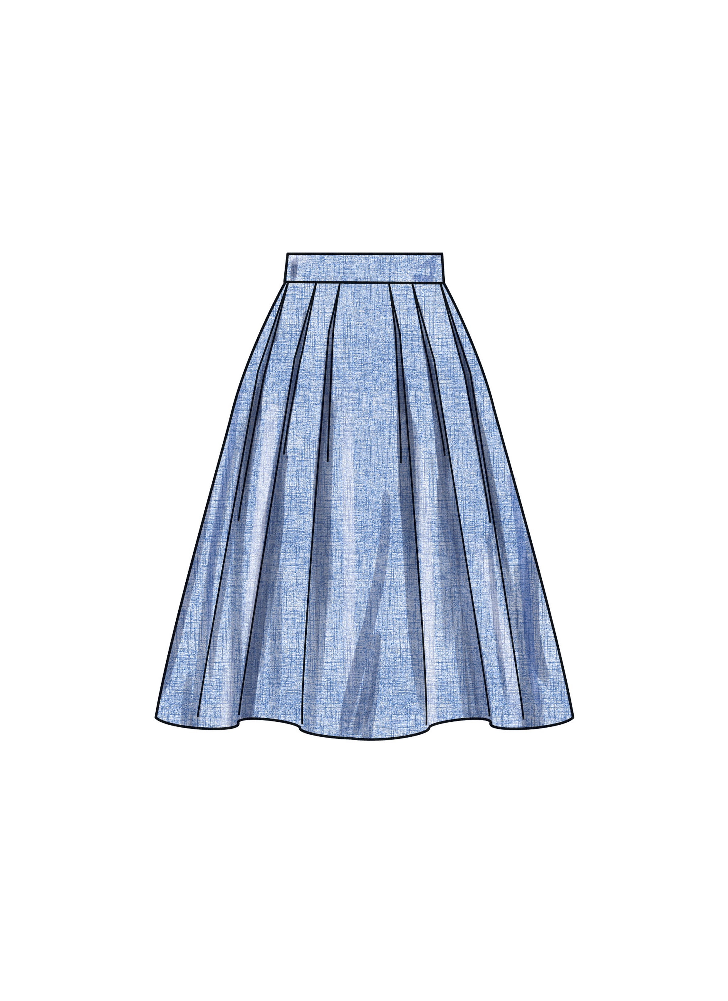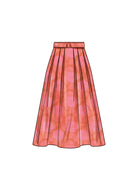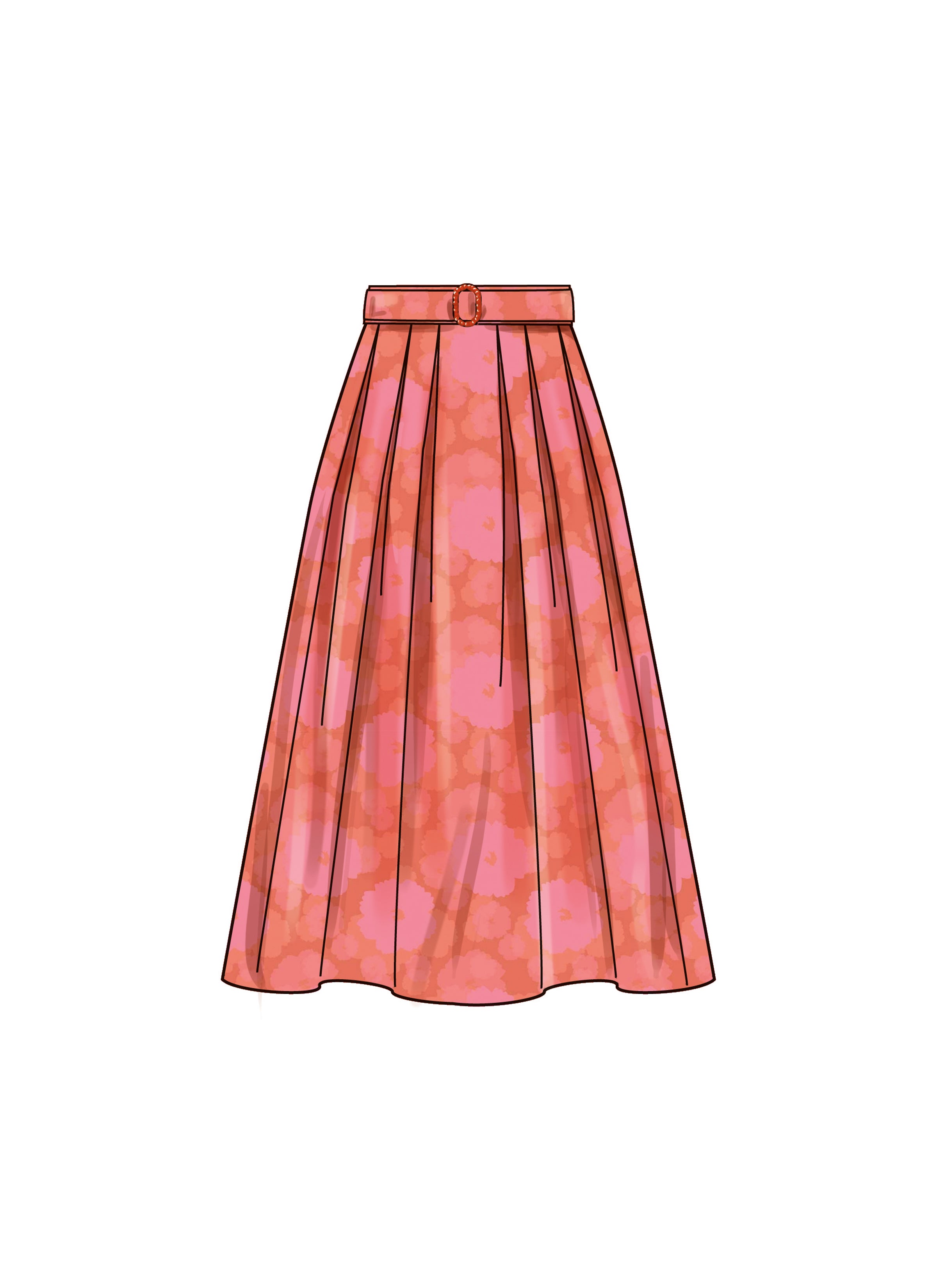 Pleated skirt in three lengths comes with contoured waistband and side seam pockets. Skirt A has belt set in side seams. Skirt C has a pleated self tie.