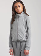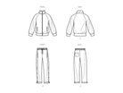 Jacket has raglan sleeves with high stand collar and front zipper opening. Pull-on pants have side panels and split leg below the knee with snap details. Jacket and pants include zippered pockets.