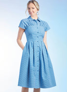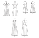 Button front dresses in three lengths have princess seams, inverted pleats and side seam pockets. View A dress has collar, yoke and cap sleeves. View B is a short dress with straps. View C is a halter dress that ties in the back.
