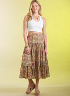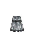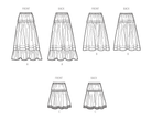 Pull on skirt with tiers and pintucks comes in three lengths: midcalf, knee and mini. View C has purchased lace trim at the hem.