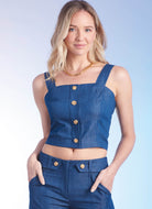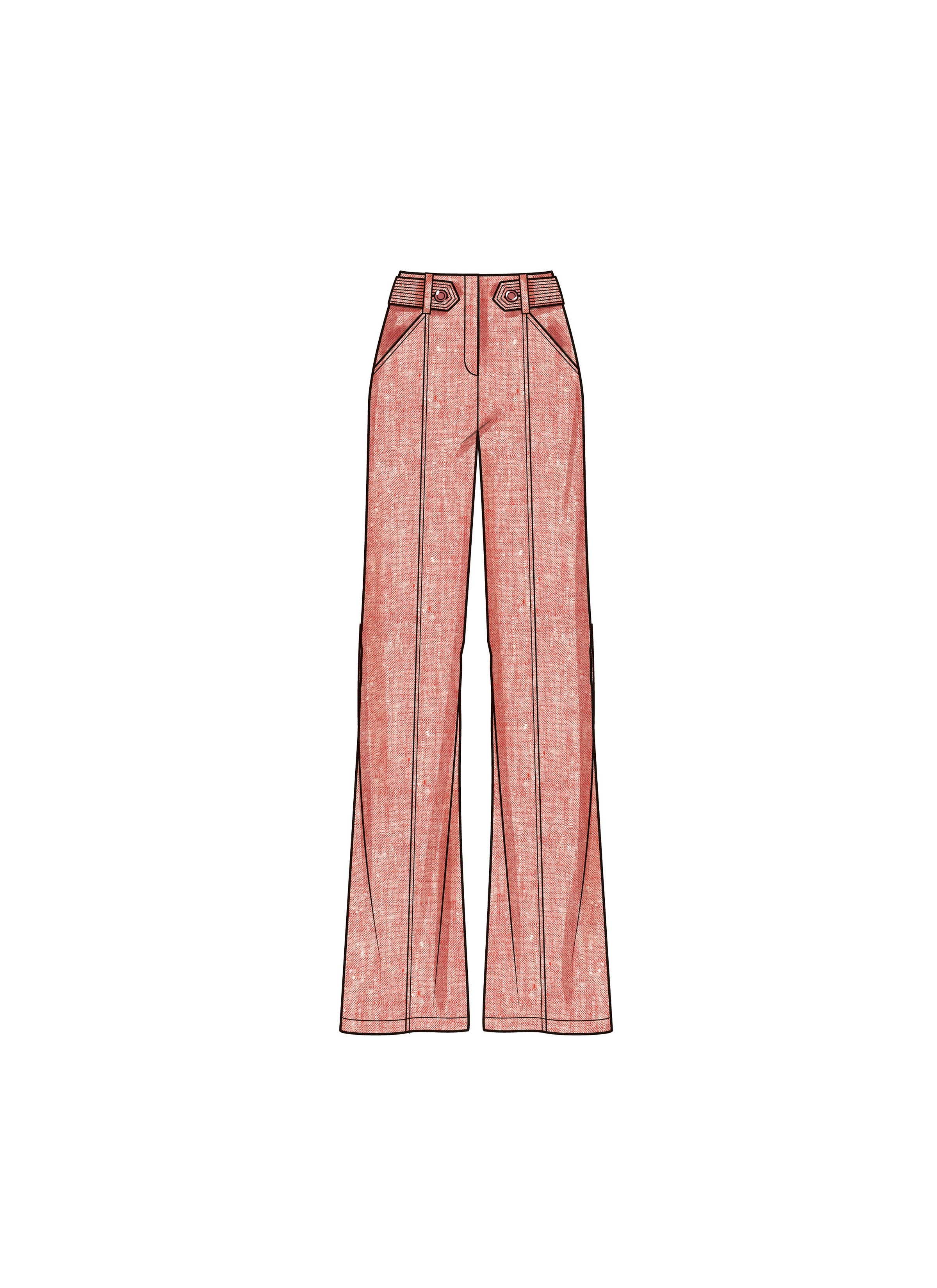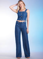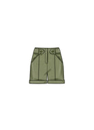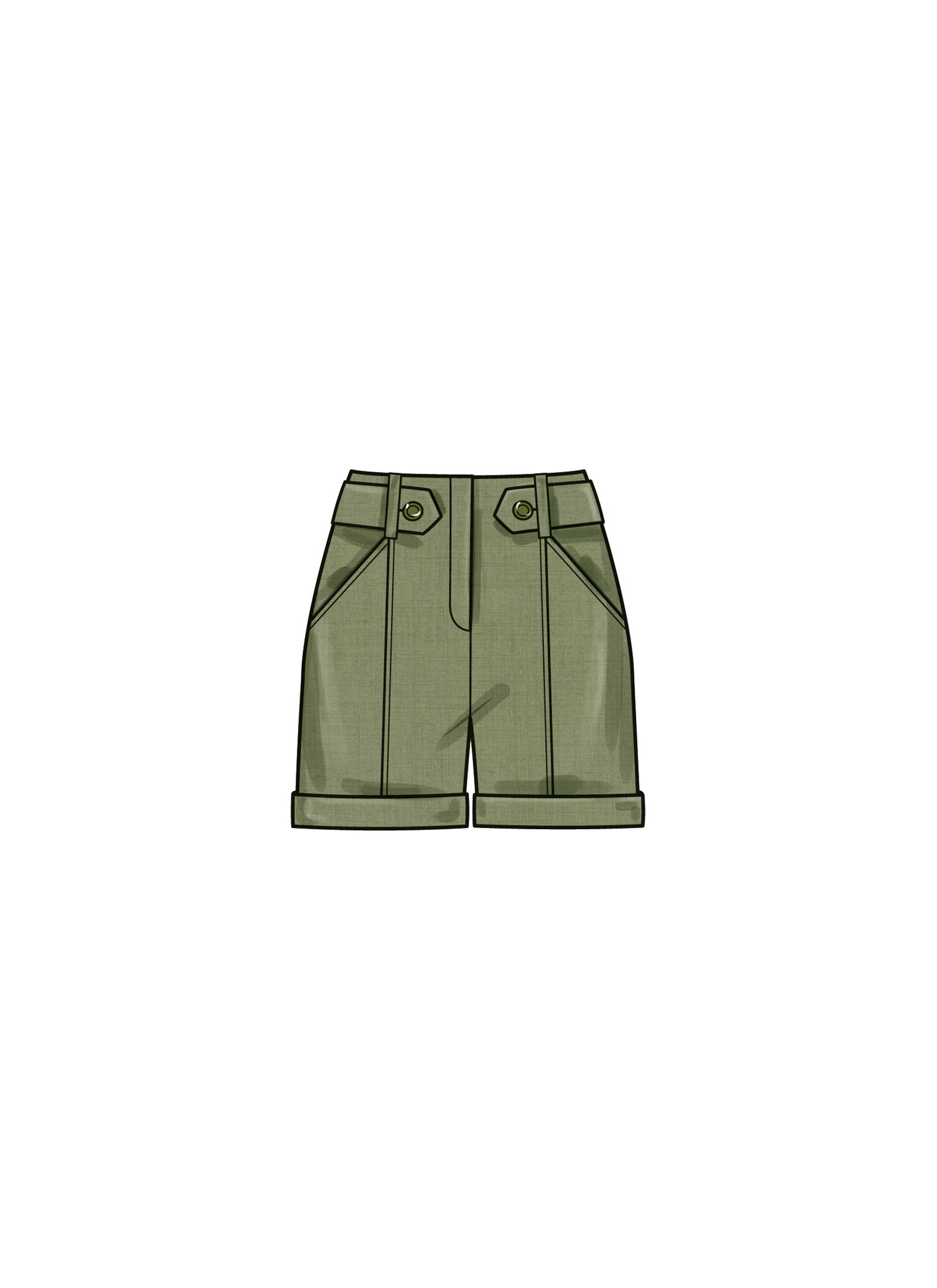 Stylish front button crop top with straps and princess seams at the front and back. Skirt, pants and shorts have center front seams and fly front zipper closure. Pants and shorts include belt with button detail and back patch pockets.