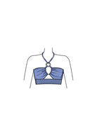 Relaxed fit button front shirt has collar, long sleeves with cuffs and back yoke with pleats. Pull-on pants have elastic waistband and self ties. Cropped fit halter top has cut out detail and O-ring that connects to bodice with loops.