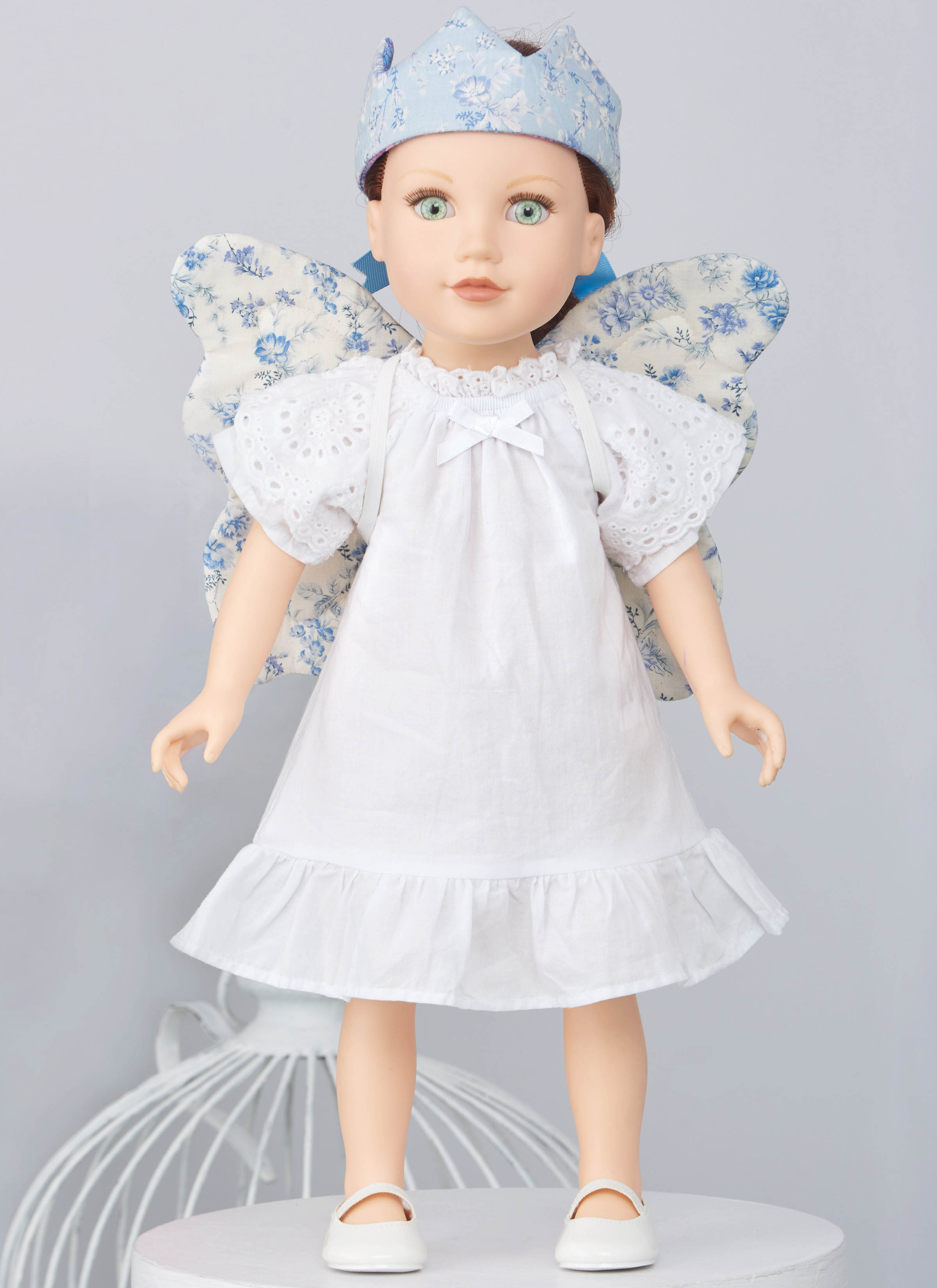 Wings in S, M, L sizes for child and 18" doll have elastic straps. Crown for child and doll ties in back and fits all head sizes. Drawstring tote has ribbon handles. Drawstring backpack has hook and loop tape on flap and outside patch pocket with ribbon straps.