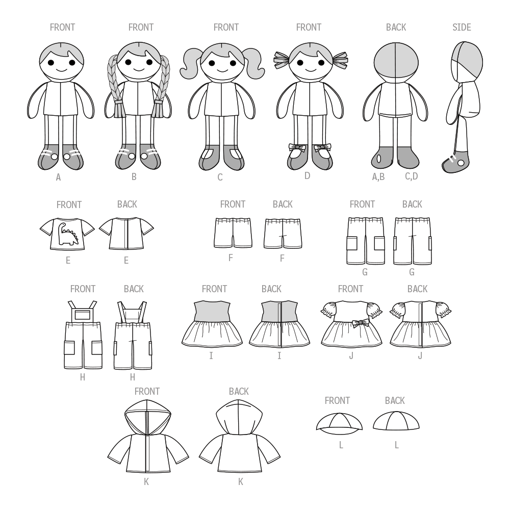 Dolls have a variety of pigtail and braid hairstyles. Clothes include top, shorts, pants, overalls, dresses, jacket, hat, and an option of sneakers or shoes.