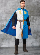 Easy pullover tabards in mid-calf or knee length have center front and back slits with ribbon trim, bias finished necklines and can be made solid or color-blocked. Capes in mid-calf and below knee length have shoulder tabs and cord front ties. Motifs for shield and heraldry emblems to mix and match included. One size fits most adults. See envelope for more information.