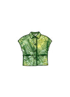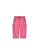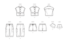 Easy to sew toddler set includes button front shirt with collar and pockets, pull on cropped pants and shorts with drawstring plus a bucket hat in sizes S-M-L.