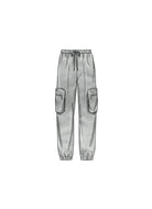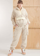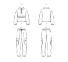 Front half zip sweatshirt has dropped shoulders, long elasticized sleeves, elastic cord at the waist and front pocket with contrast flap. Pull-on track pants have tie cord and elastic at waist and hem plus two cargo pockets with zipper.