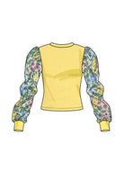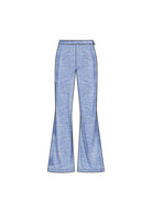 Top with long or short sleeves features a knit bodice and woven sleeves. Top view A sleeve band also in knit. Pants with flared leg have side seam pockets and invisible zipper.