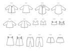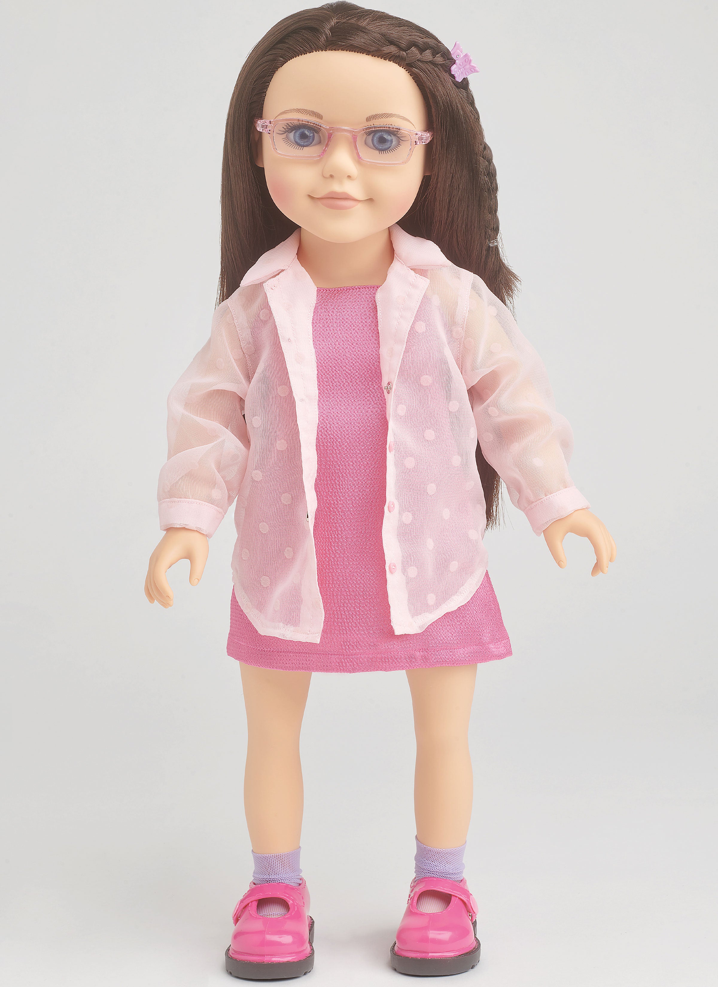 90's look, mix and match pieces for 18" dolls include faux placket cardigan and shirt with snap front closure. Ribbon strap top and dress and pants with stitched details all have back hook and loop tape closure. Faux placket pull on skirt has back elastic.