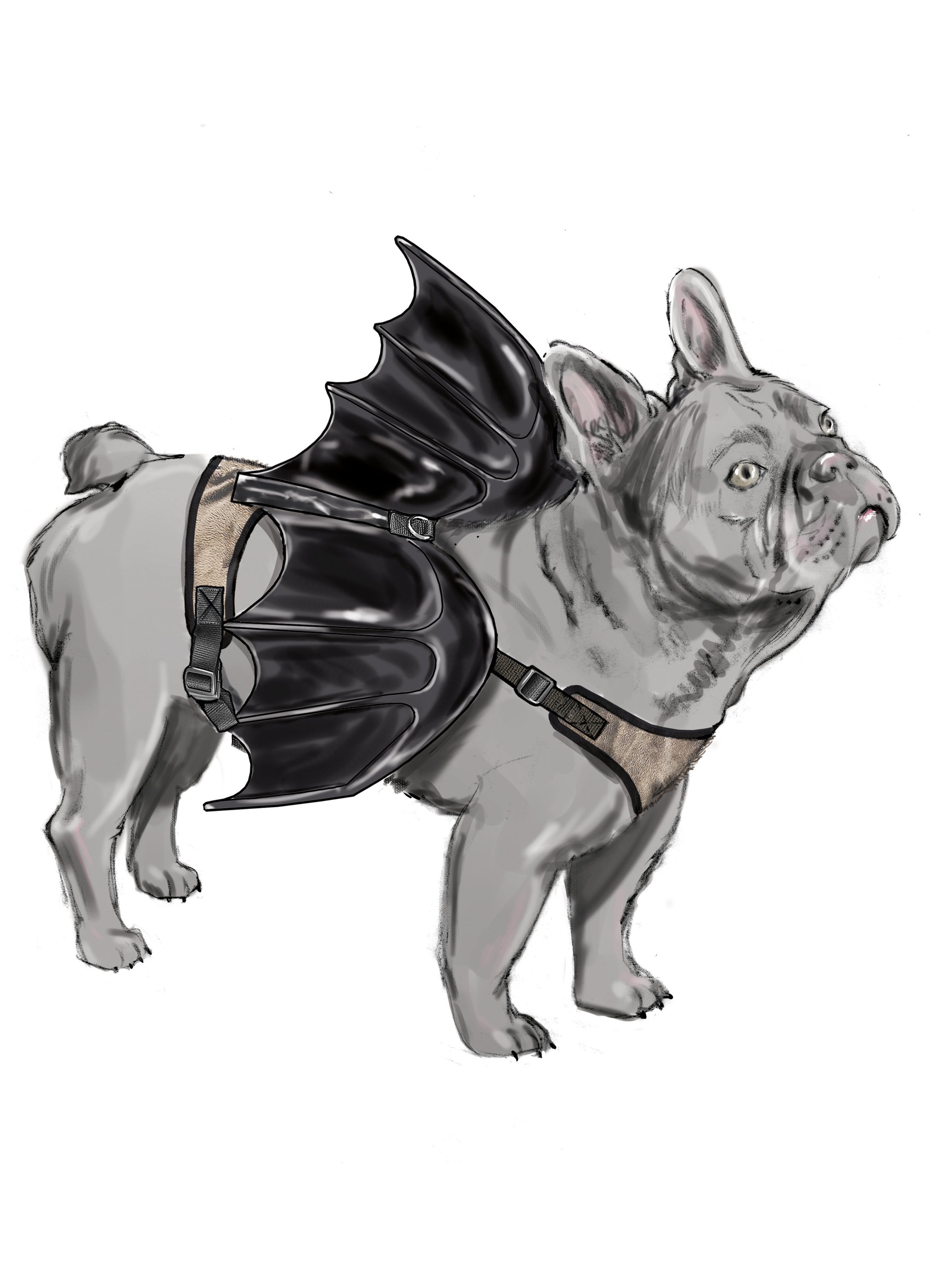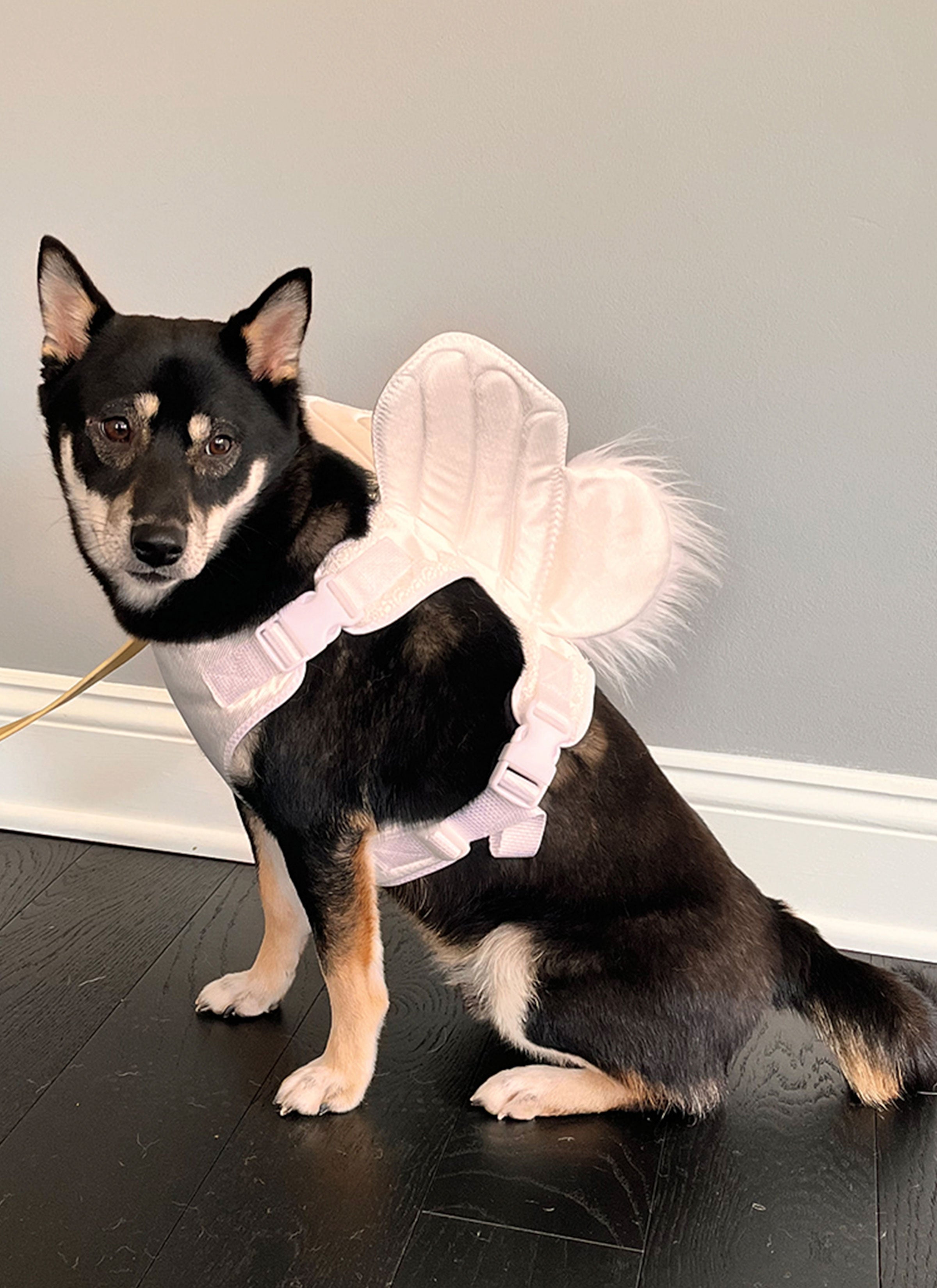 Lightly-padded harnesses for dogs in three sizes with parachute clip closures, adjustable webbing straps and D-rings for leash attachment have bias-tape finished edges and lightly-padded wings. Large wings with stitched skeleton effects can be dragon, bat or devil characters. Butterfly and fairy wings have sheer overlays, encasing battery-operated LED fairy lights. Angel wings have novelty trim and lower wing overlays. See envelope for more information.