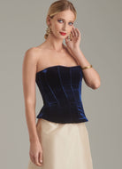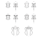 Lined boned corsets have back corded loops for lacing with dipped front hem that skims over the hipline and rises at the back. Design options include wide upper cuff, purchased lace appliques, novelty fringed trim and front button trims. Sash with front cummerbund styling and wide tie ends has front lining from net for structure and volume. See envelope for more information.