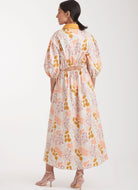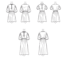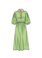 Relaxed fit shirt dress with elastic waist and side seam pockets. Includes an optional pointed collar and placket that can be made in a contrasting fabric. Dress has a forward drop shoulder with full pleated sleeves and elastic closures in two sleeve length variations. Dress also comes in two length options as well as an optional cut out at the back waist.