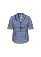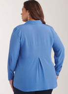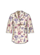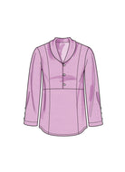 Raised waist tops with shawl collar have partial button front, two length options and sleeve variations. Top C has a released pleat on the sleeve.