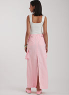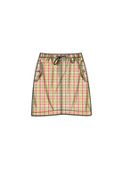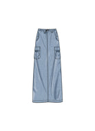 Cargo skirts with drawstring waist band have side seam pockets with flaps and snap button closures. Skirts B and C have patch pockets and back vents.