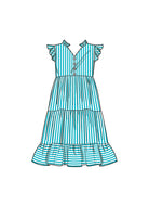 Tiered dress with decorative button front includes ruffled collar and side seam pockets. Dress comes in two length options and three sleeve variations. Back of dress has an invisible zipper.