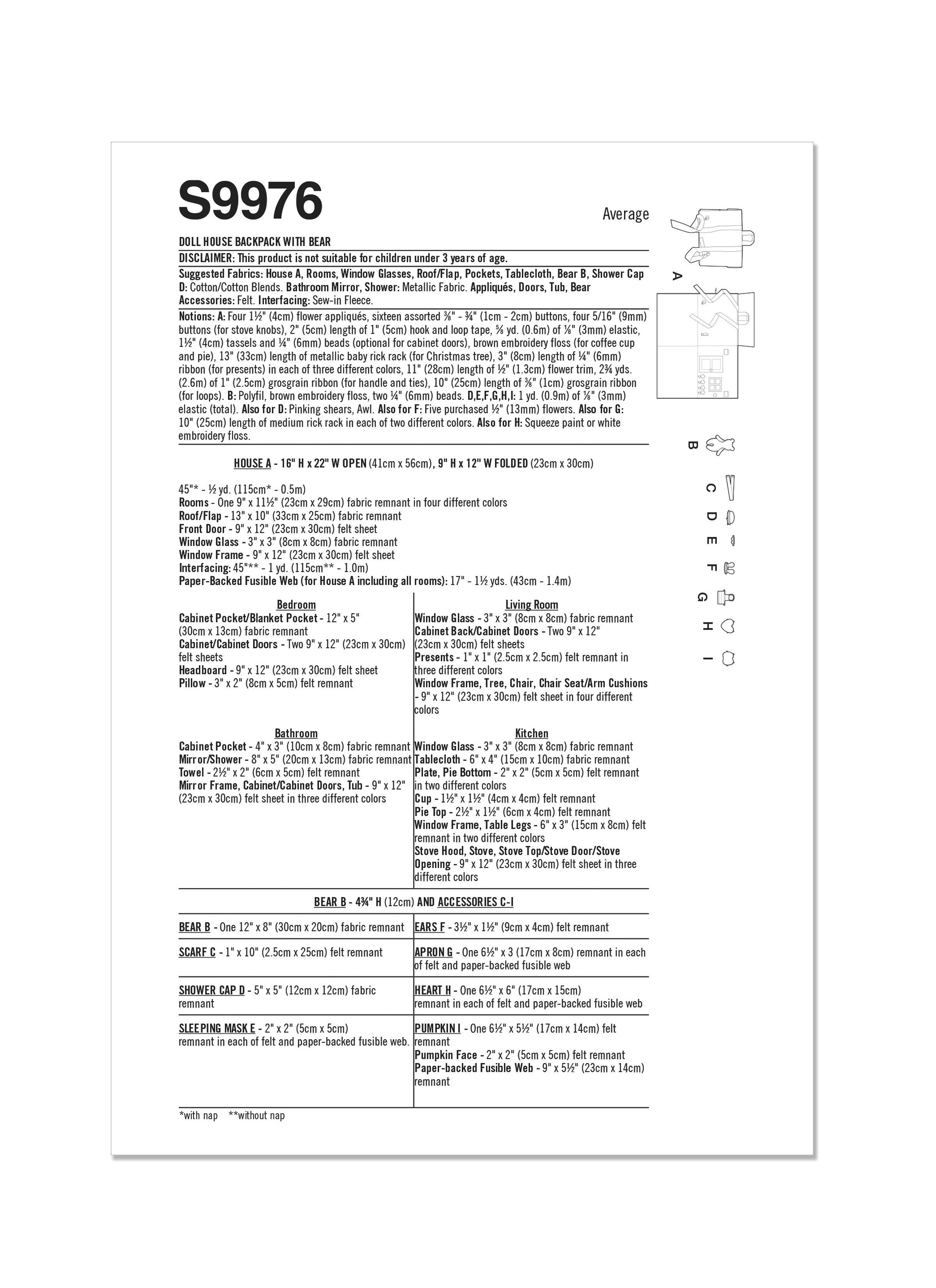 Simplicity Sewing Pattern S9976 - Doll House Backpack with Bear