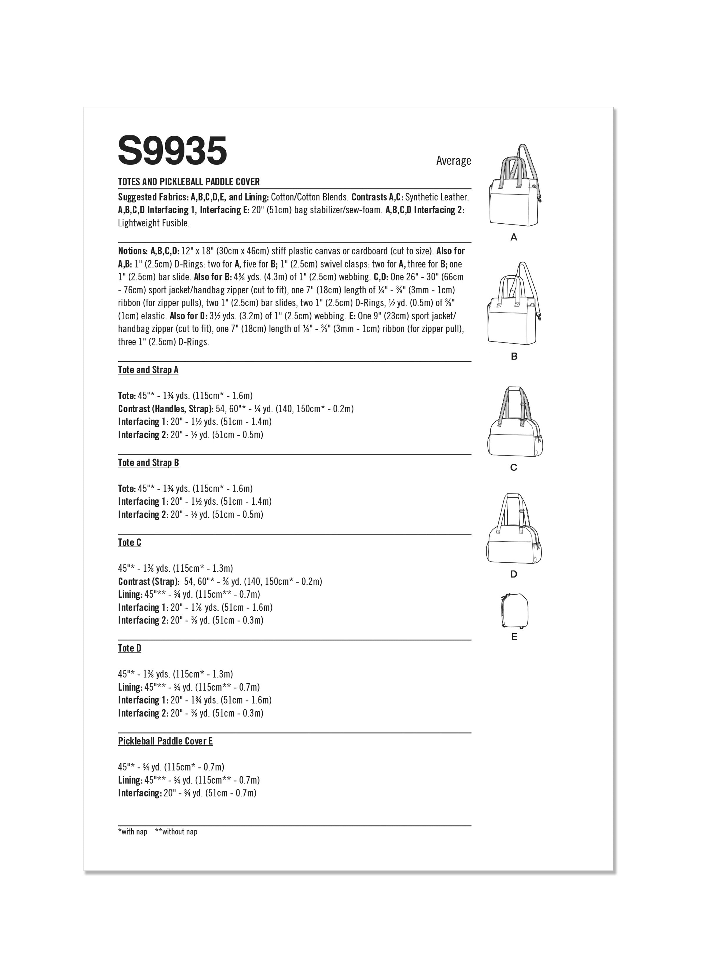 Simplicity Sewing Pattern S9935 - Totes and Pickleball Paddle Cover