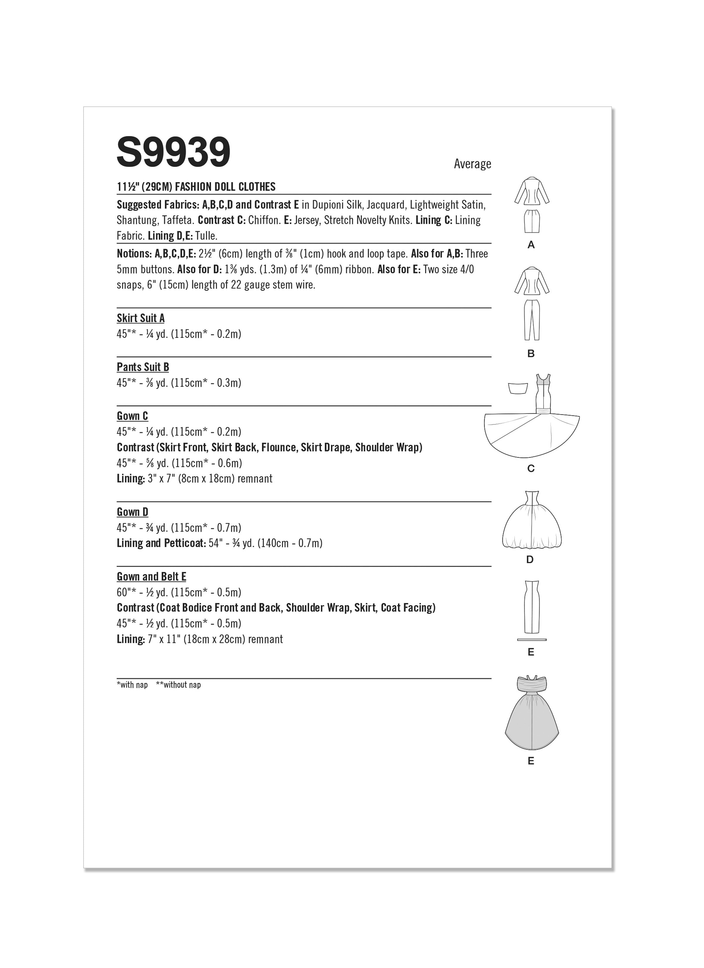 Simplicity Sewing Pattern S9939 - 11 1/2” Fashion Doll Clothes by Andrea Schewe Designs