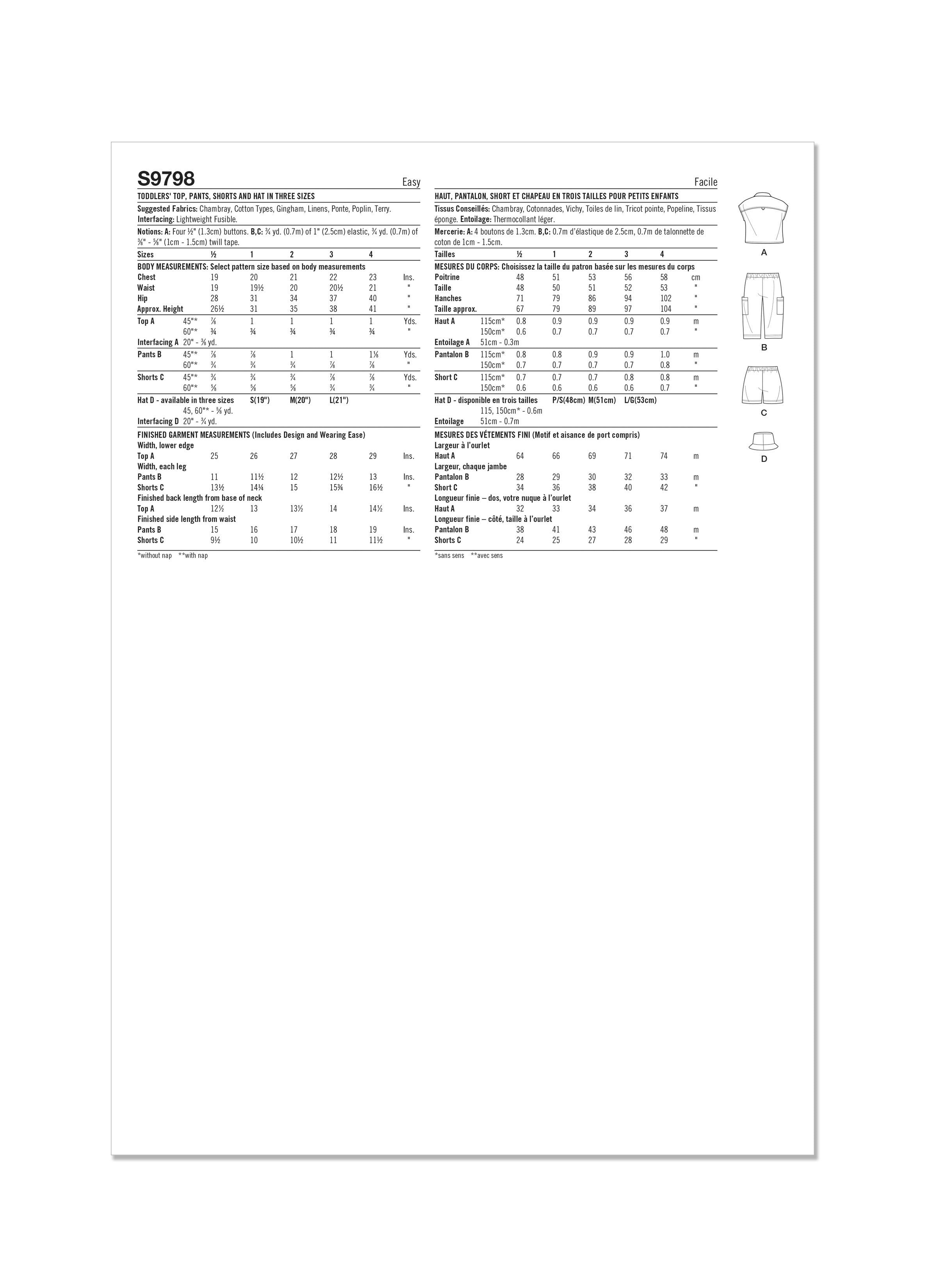 Simplicity Sewing Pattern S9798 - Toddlers' Top, Pants, Shorts and Hat