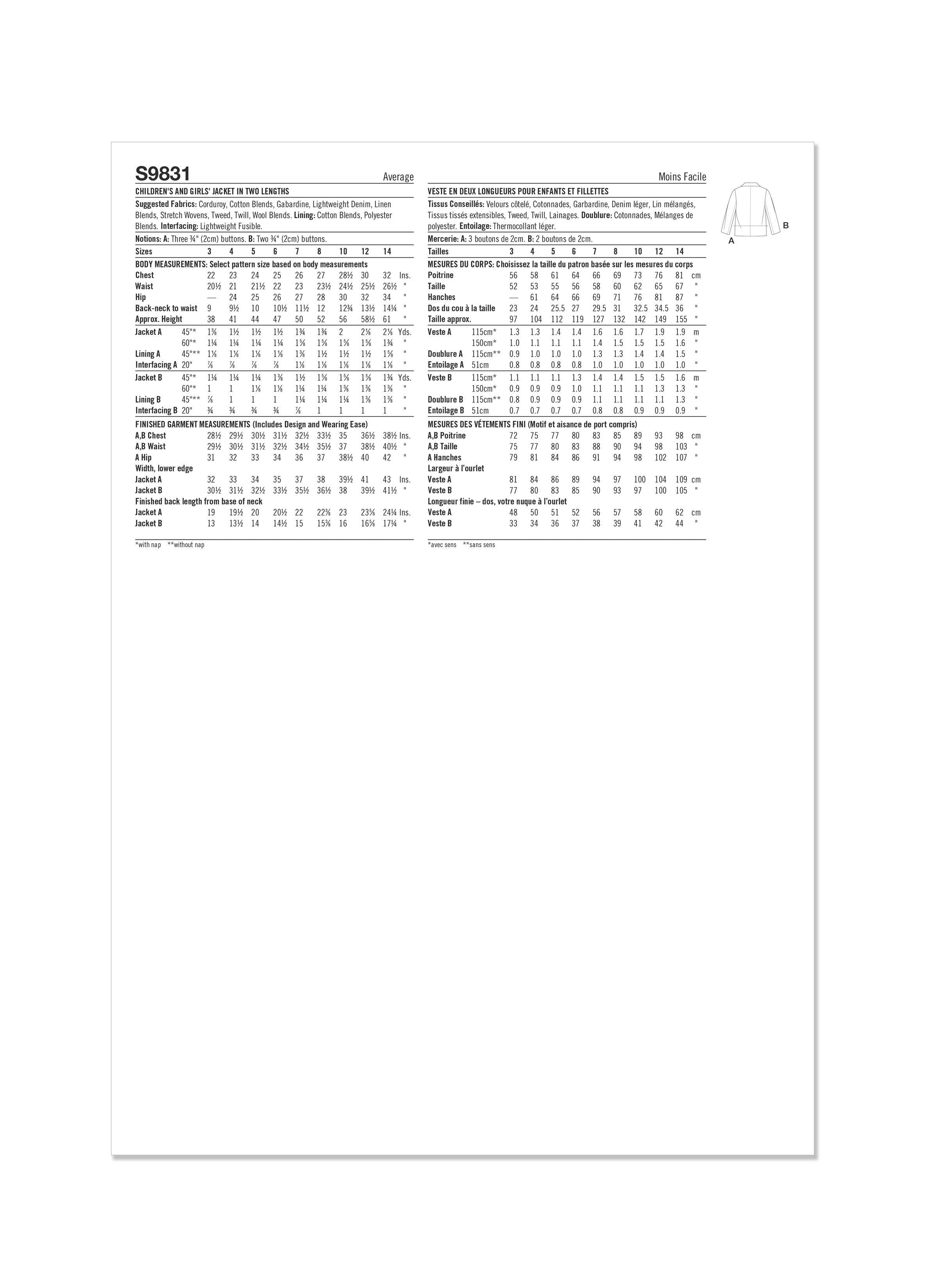 Simplicity Sewing Pattern S9831 - Children's and Girls' Jacket in Two Lengths