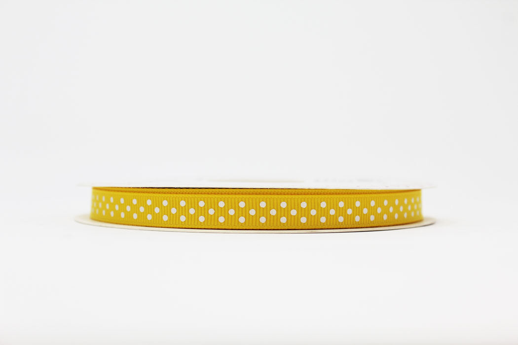 A simple but sweet polka dot ribbon in a pretty yellow colour with polka dots. Great for some bunting, bags or even finishing off a dress or top.