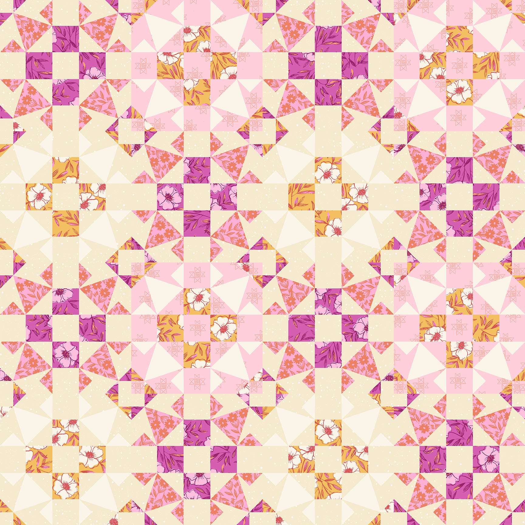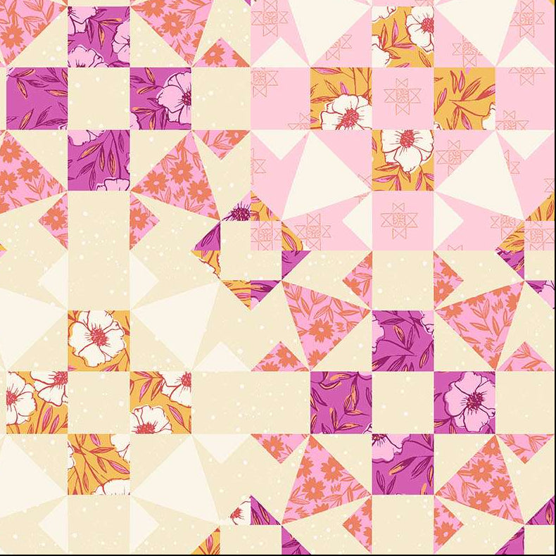 Stephanie Organes is back with another warm and inviting floral collection for Andover Fabrics. Modern flower illustrations are mixed with tones of purple, pink, orange and mustard for a fresh take on floral. This amazing blocks print looks just like patchwork piecing, but without the effort of putting it all together yourself!