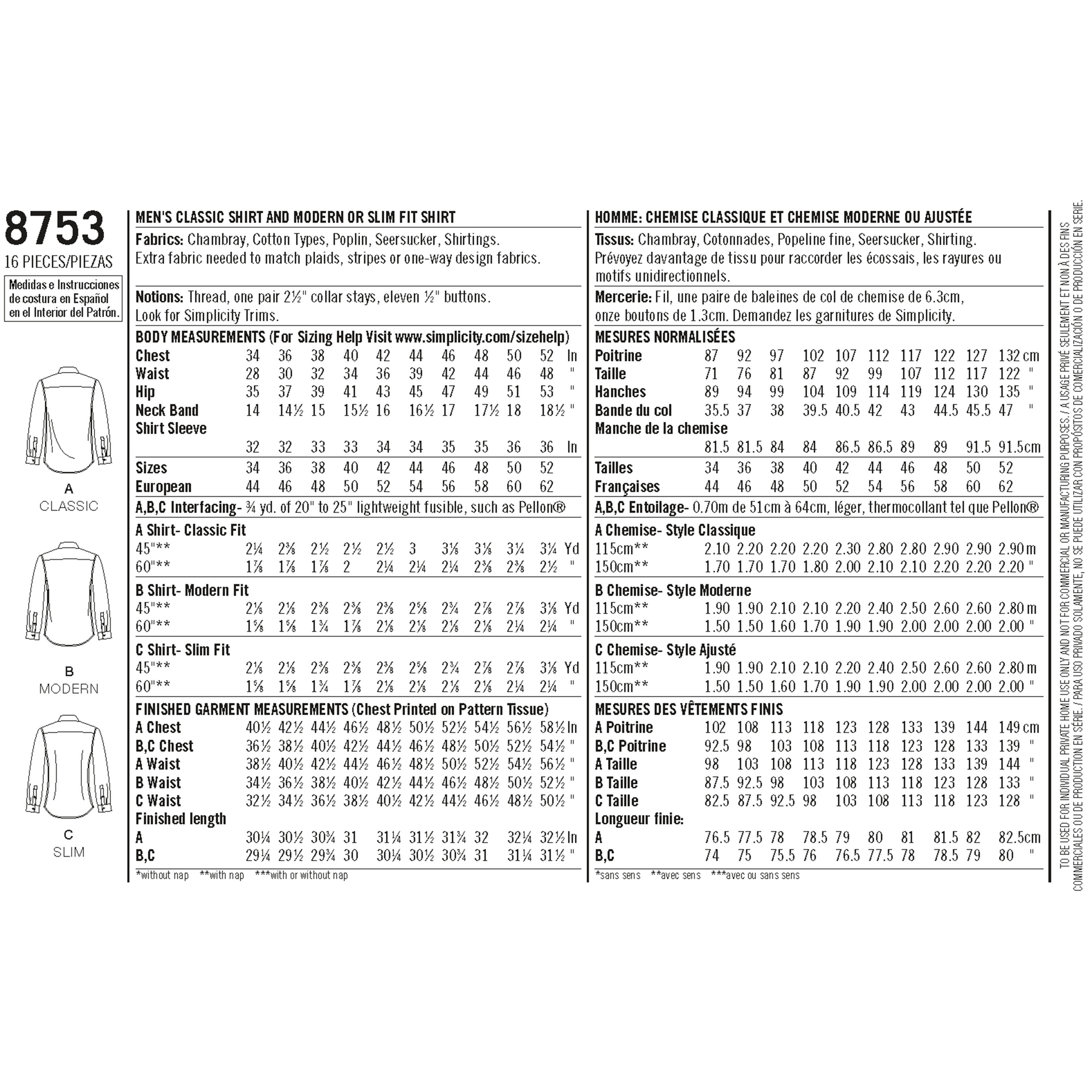 Simplicity Sewing Pattern S8753 - Men's Classic, Modern and Slim Fit Shirt
