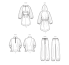 Anorak style jacket with hood features front cargo pocket, half front zipper, elastic waist cording, and elastic at sleeves. View B is a poncho that includes half zip front and snap fasteners under sleeves. View C are pants with drawstring ties and elasticized cuffs.