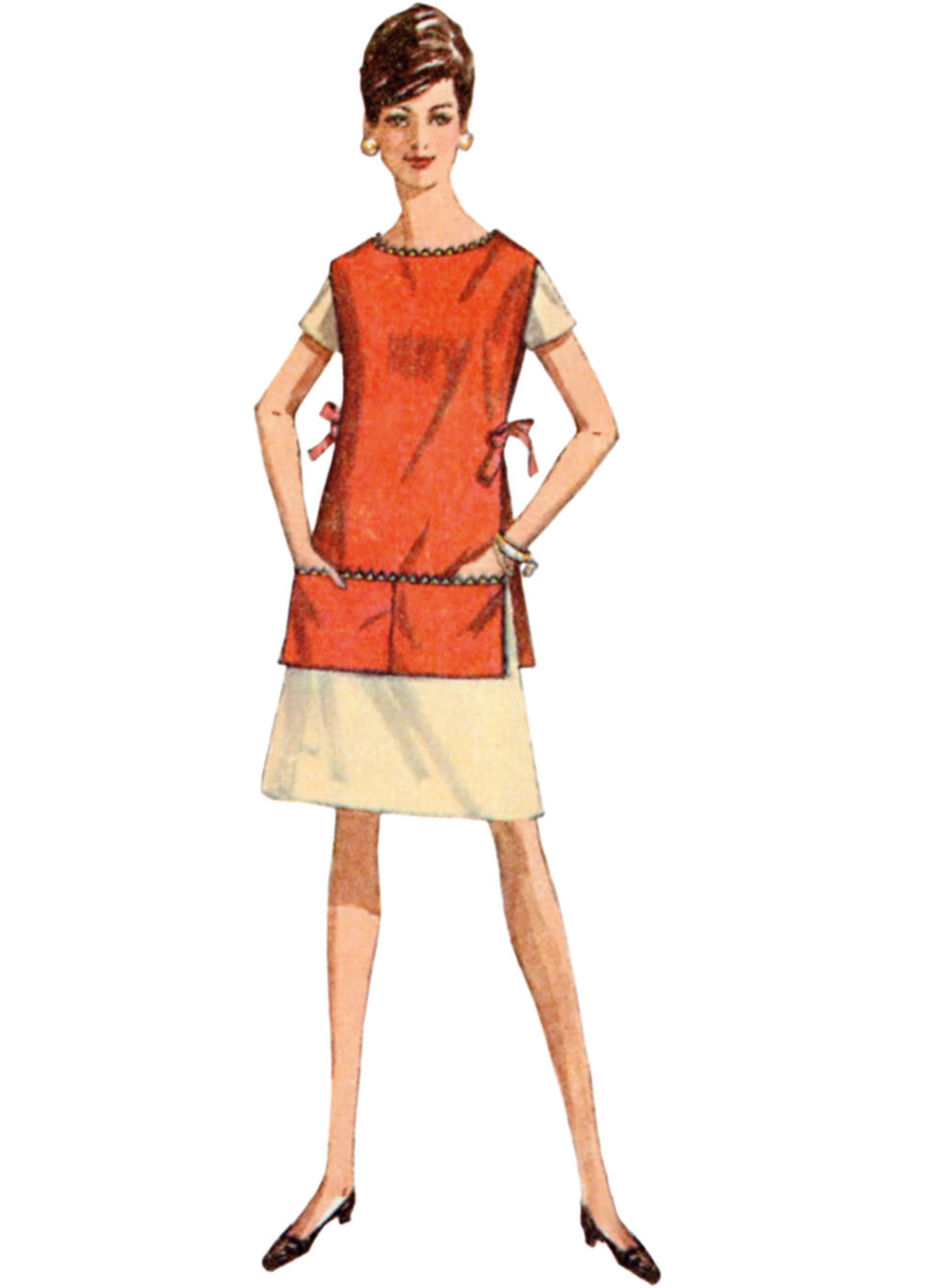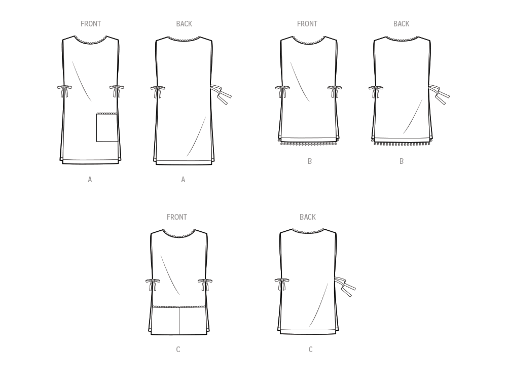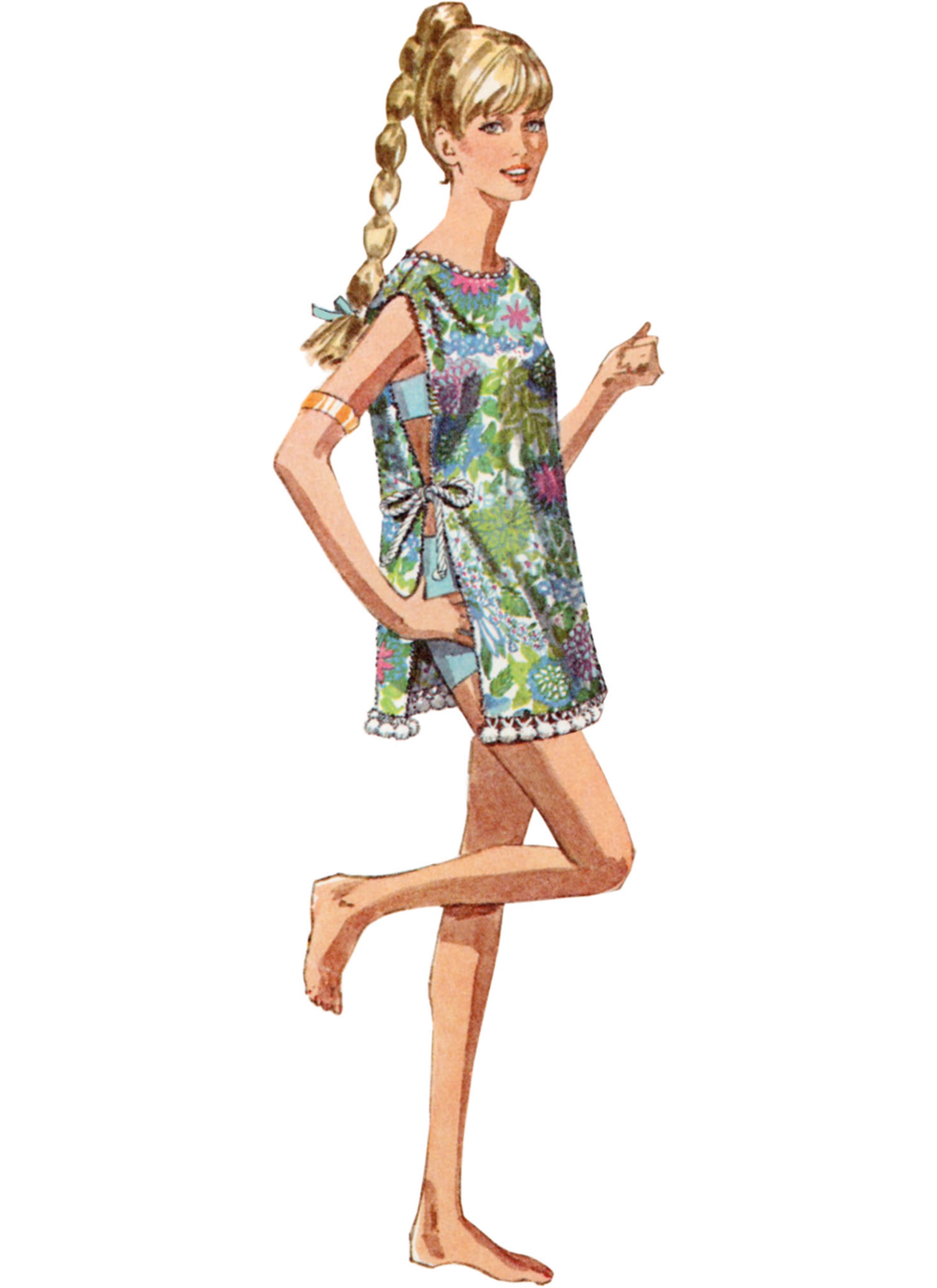 Direct from the Simplicity Archives, this easy apron or beach cover-up is made with only two main pattern pieces. All are open at sides with lowered round neckline, jumbo rick-rack trim and ribbon or cable cord side ties. Options include patch pocket or shorter length with large ball fringe trim or cobbler-type pocket. One size fits most adults. See envelope for more information.