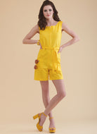 Vintage 1960'S Jiffy easy-to-sew one-piece jumpsuit and romper has low round neckline, front zipper closing, button trim, optional patch pockets, and self fabric tie belt. Authentic Vintage Reproduction has two main pattern pieces and includes additional size options and cutting layouts.