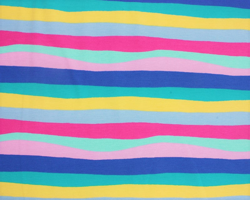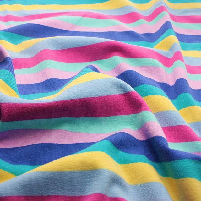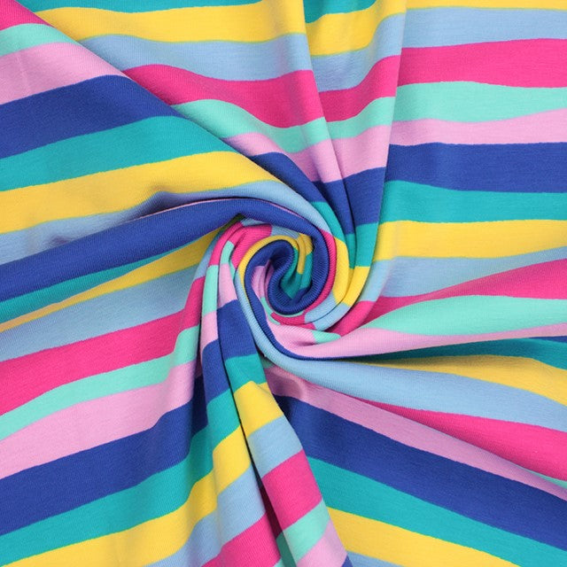 Indulge yourself in some of this gorgeous soft, fun printed jersey, perfect for making clothes! With 4-way stretch and a high percentage of cotton, it's super comfortable against the skin and easy to wear. We love this colourful rainbow stripe in summery shades that have us thinking of sunny days on the beach with an ice cream...